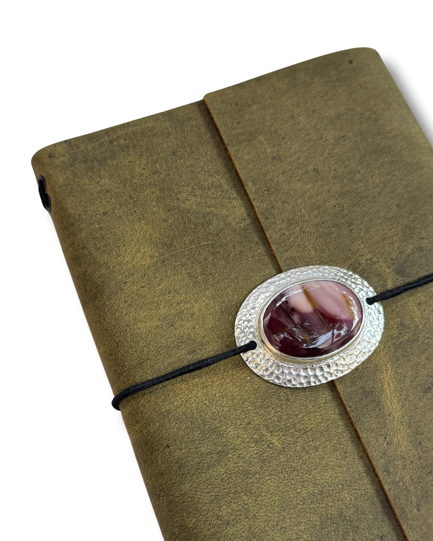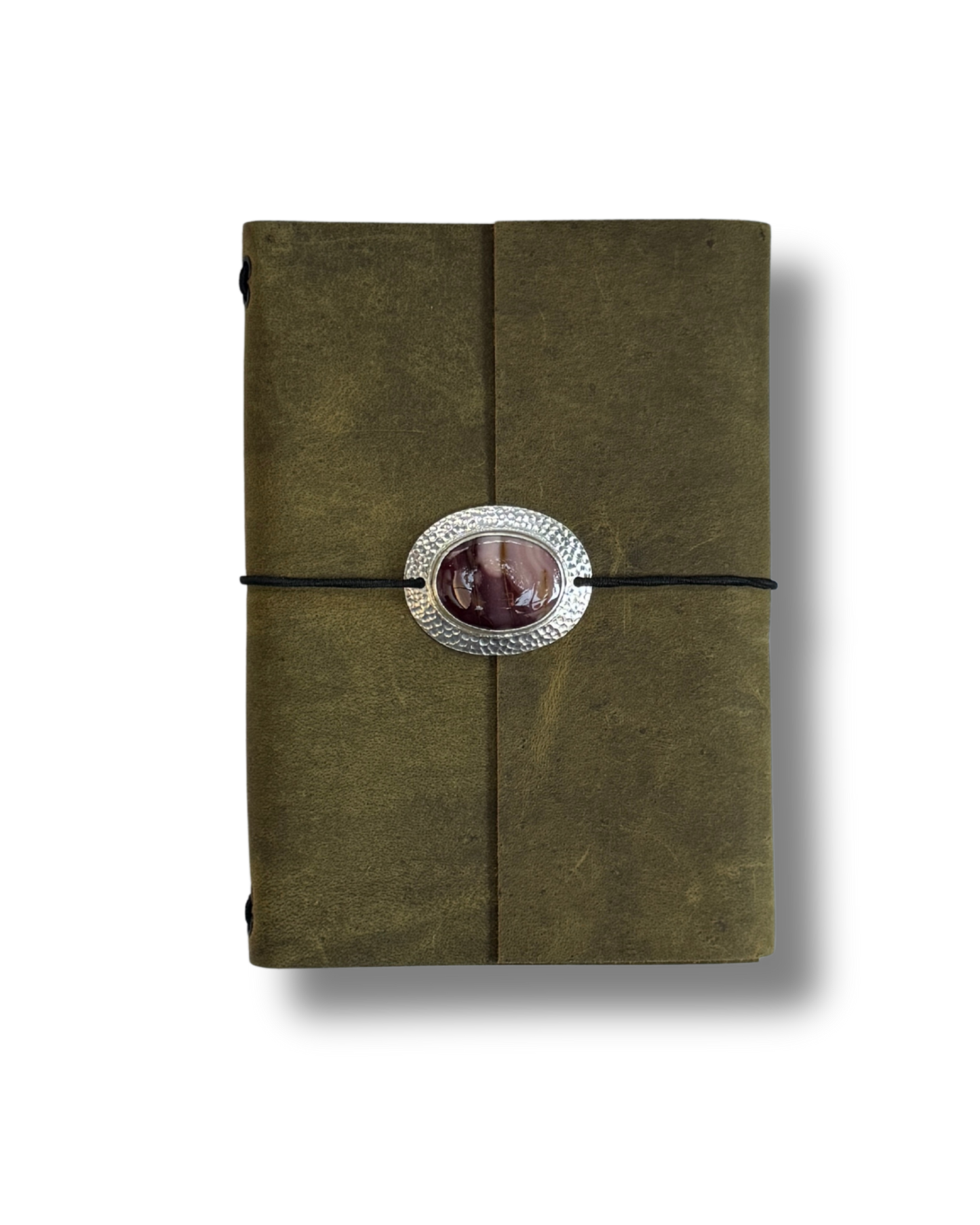 Unikátní kožený deník s výměnnými bloky a ručně vyrobenou sponou s pravým kamenem. Každý zápisník je ručně vyráběný originál.