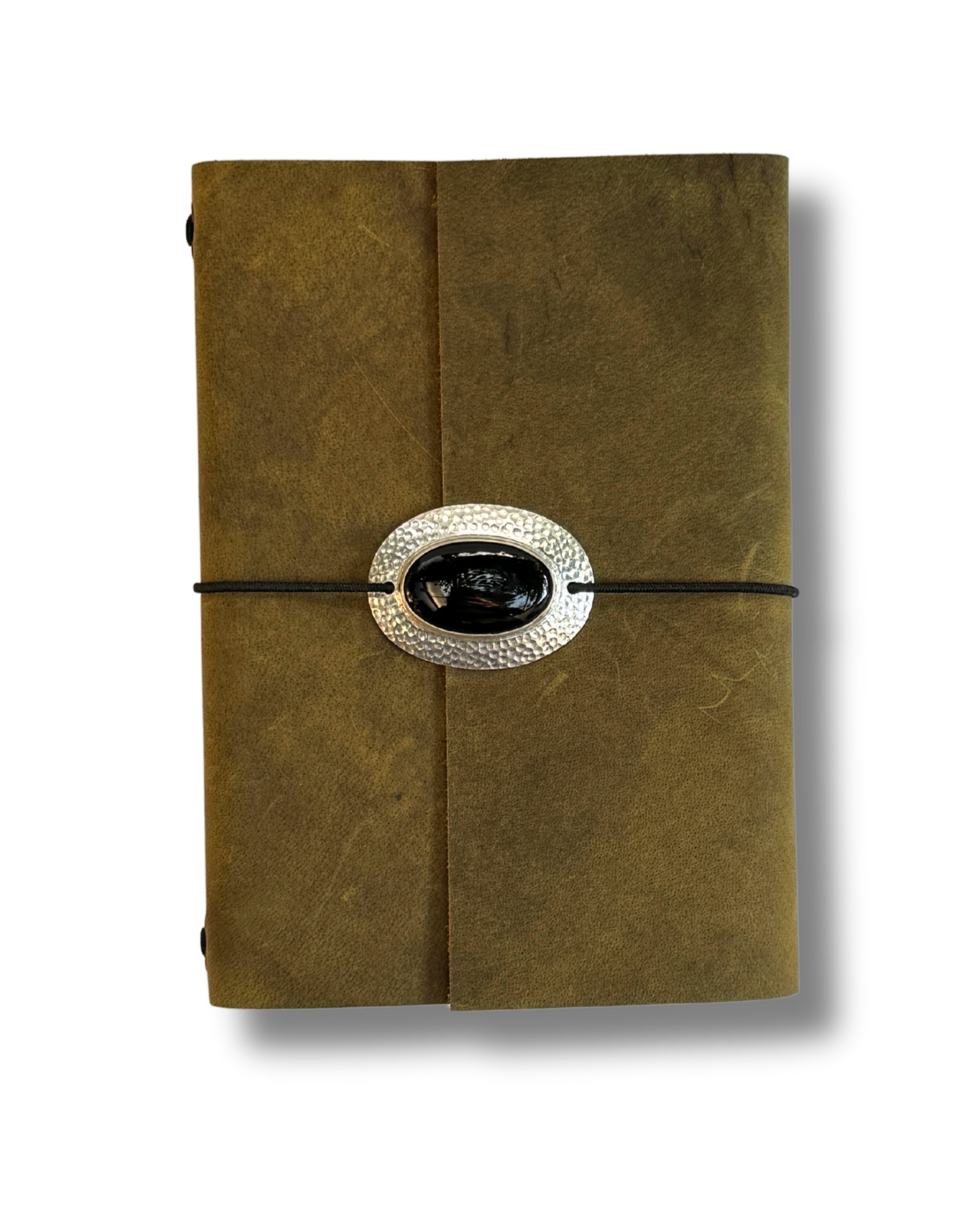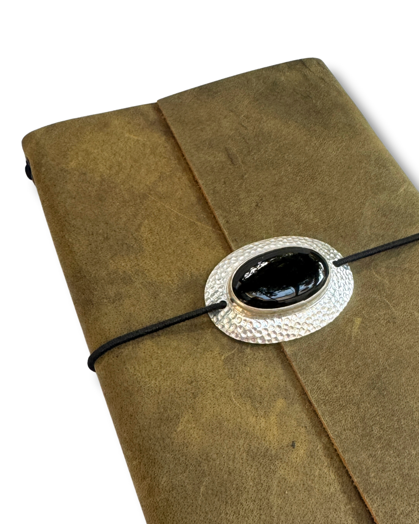 Unikátní kožený deník s výměnnými bloky a ručně vyrobenou sponou s pravým kamenem. Každý zápisník je ručně vyráběný originál.
