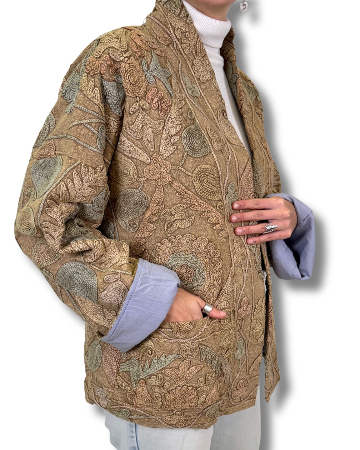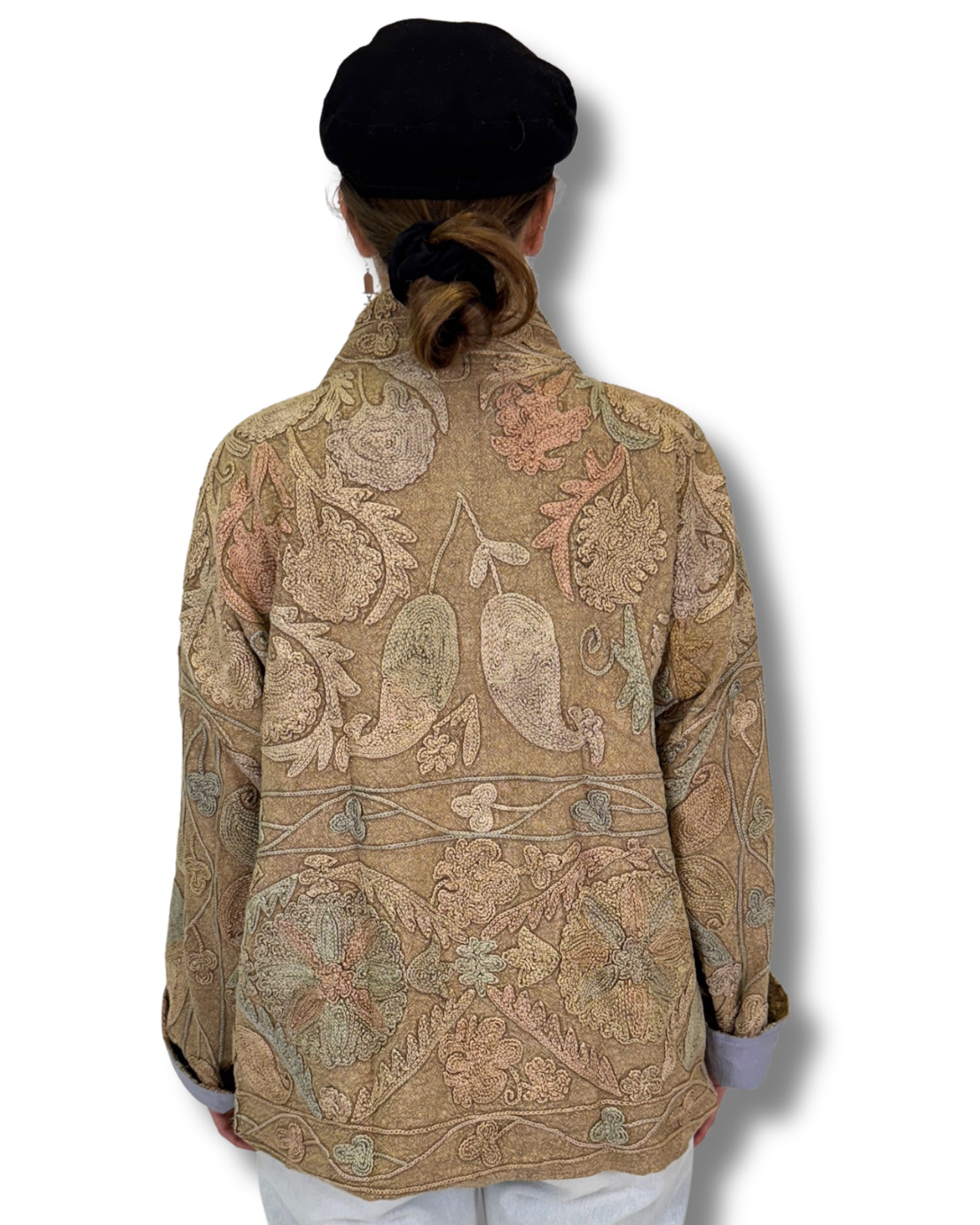 Je ideální pro vrstvení. Rukávy lze ohrnout, díky čemuž se bunda snadno přizpůsobí jakékoliv postavě i stylu. Každý kus je originál, vzniklý z jiné výšivky – žádné dvě bundy nejsou stejné.