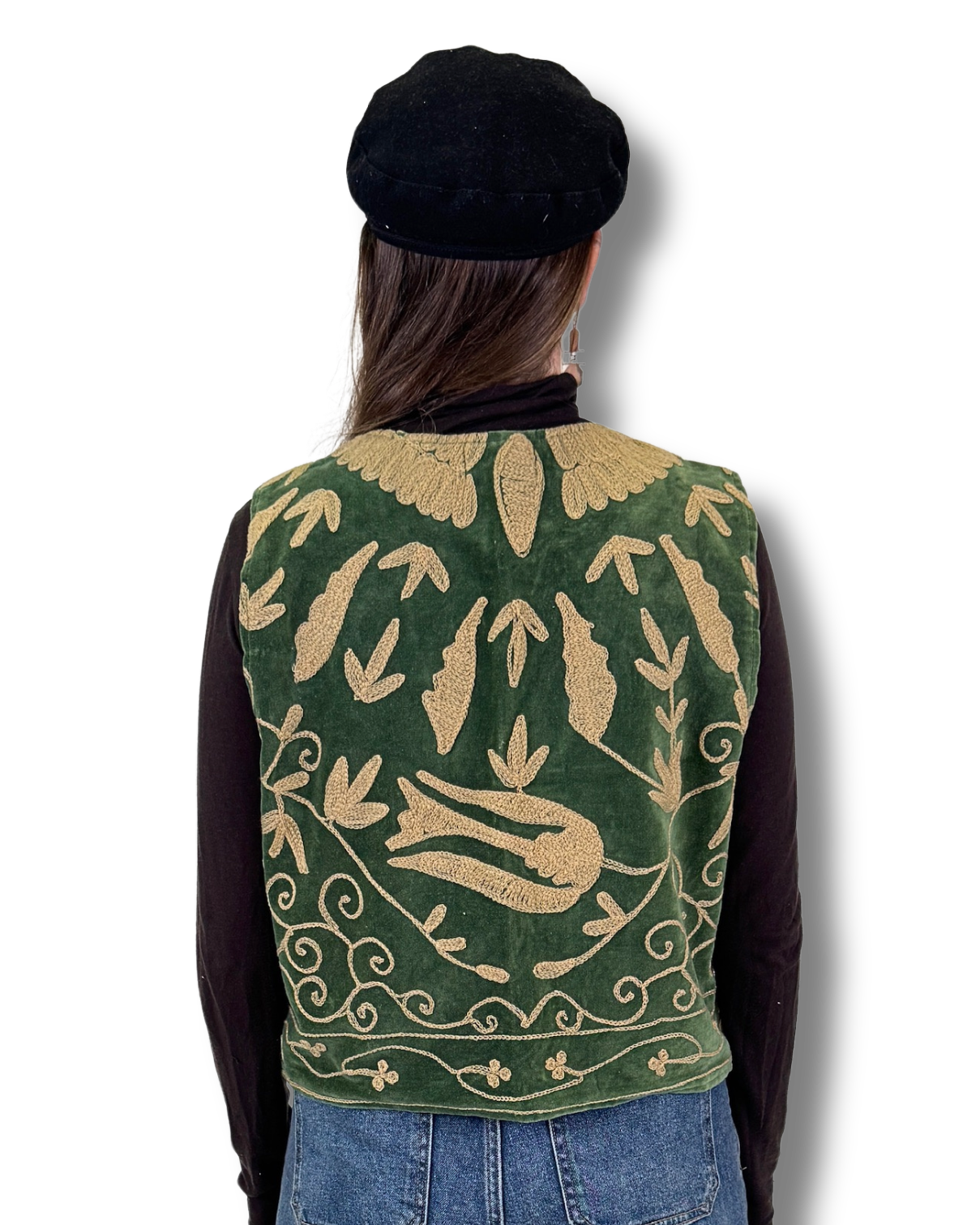 Vesta Rani vznikla z bavlněného sametu zdobeného SUZANI výšivkou. Každý kus je naprostý originál, zhotovený z jedinečné části látky, takže druhá stejná vesta už neexistuje. Luxusní samet dodává hloubku barvám i tvaru.