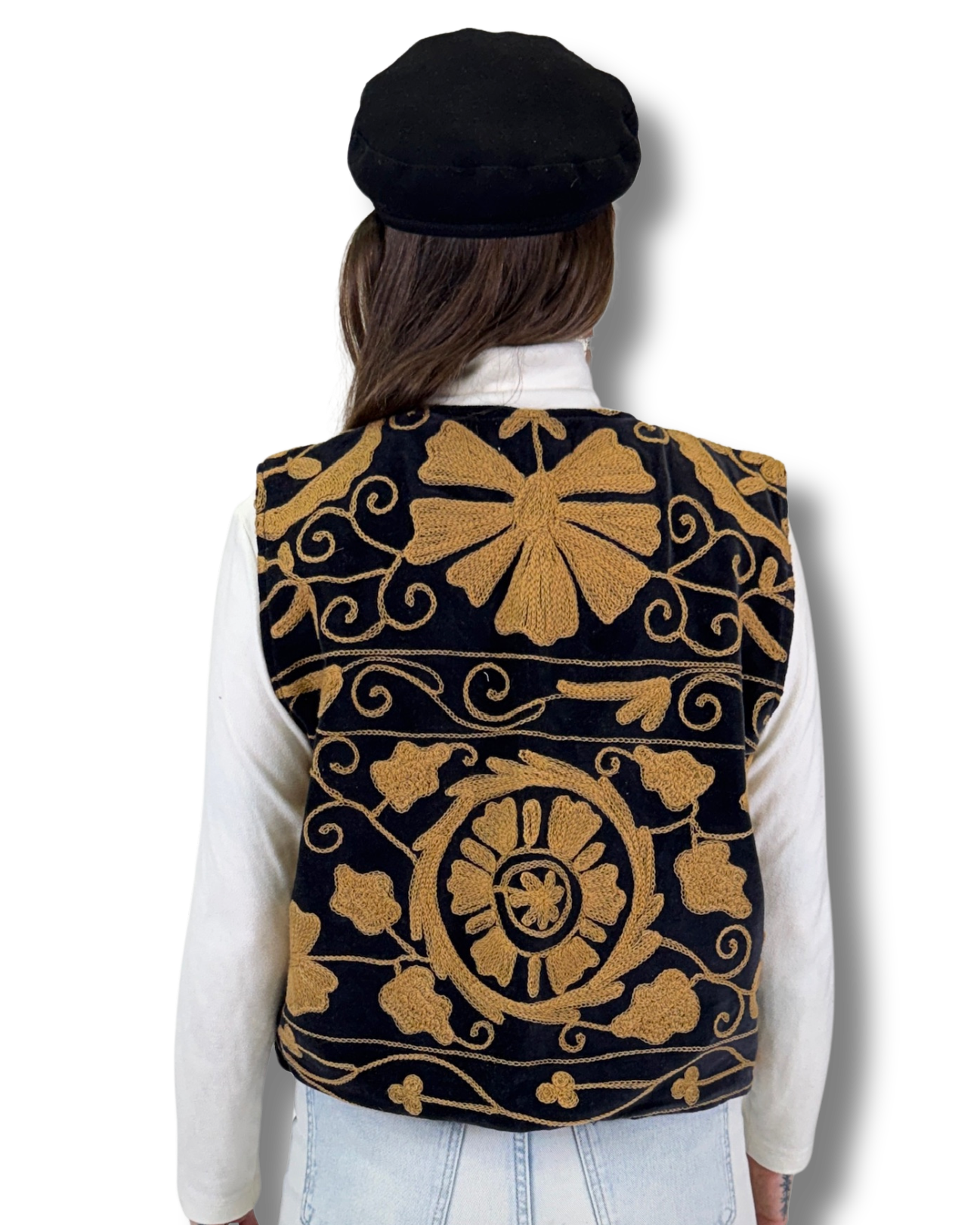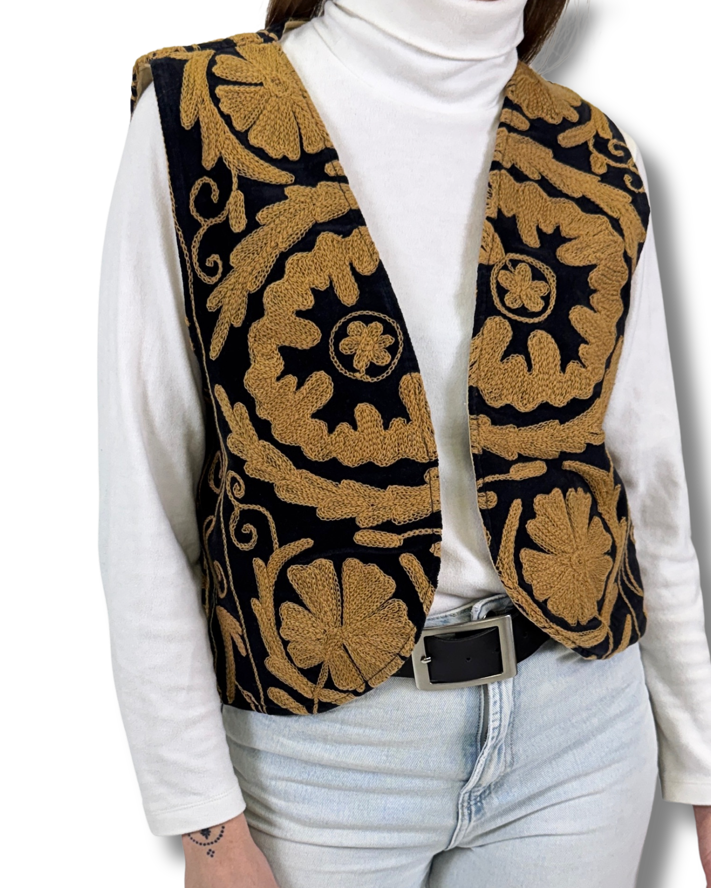 Vesta Rani vznikla z bavlněného sametu zdobeného SUZANI výšivkou. Každý kus je naprostý originál, zhotovený z jedinečné části látky, takže druhá stejná vesta už neexistuje. Luxusní samet dodává hloubku barvám i tvaru.