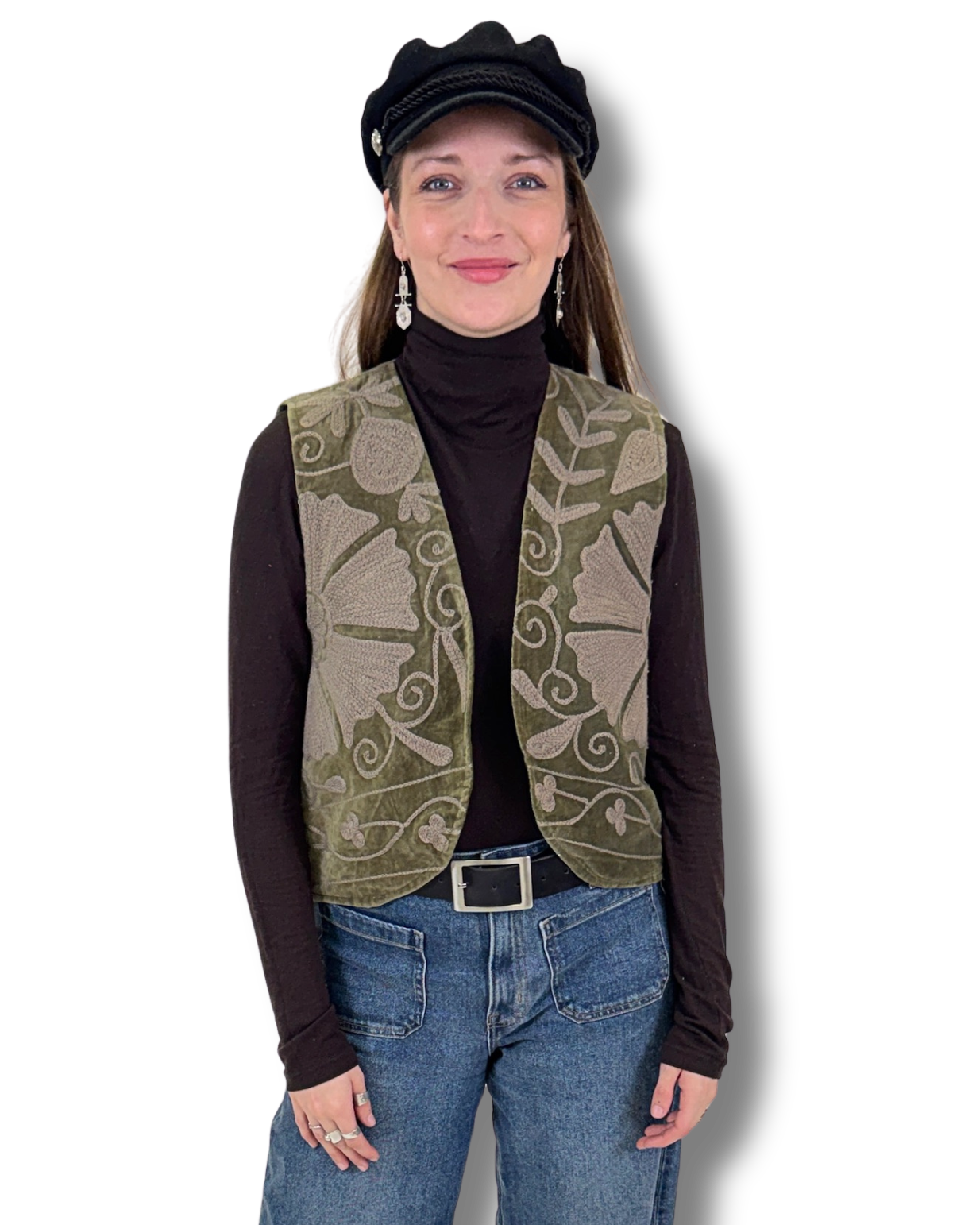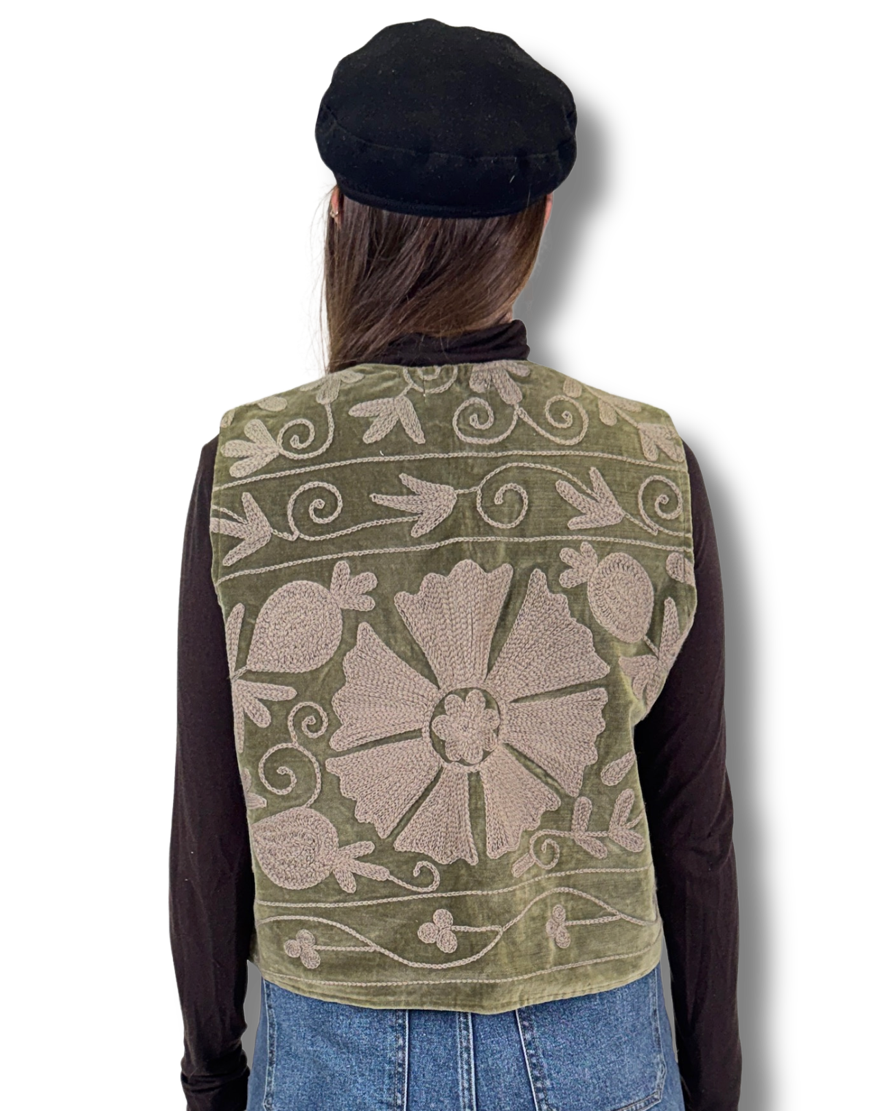 Vesta Rani vznikla z bavlněného sametu zdobeného SUZANI výšivkou. Každý kus je naprostý originál, zhotovený z jedinečné části látky, takže druhá stejná vesta už neexistuje. Luxusní samet dodává hloubku barvám i tvaru.