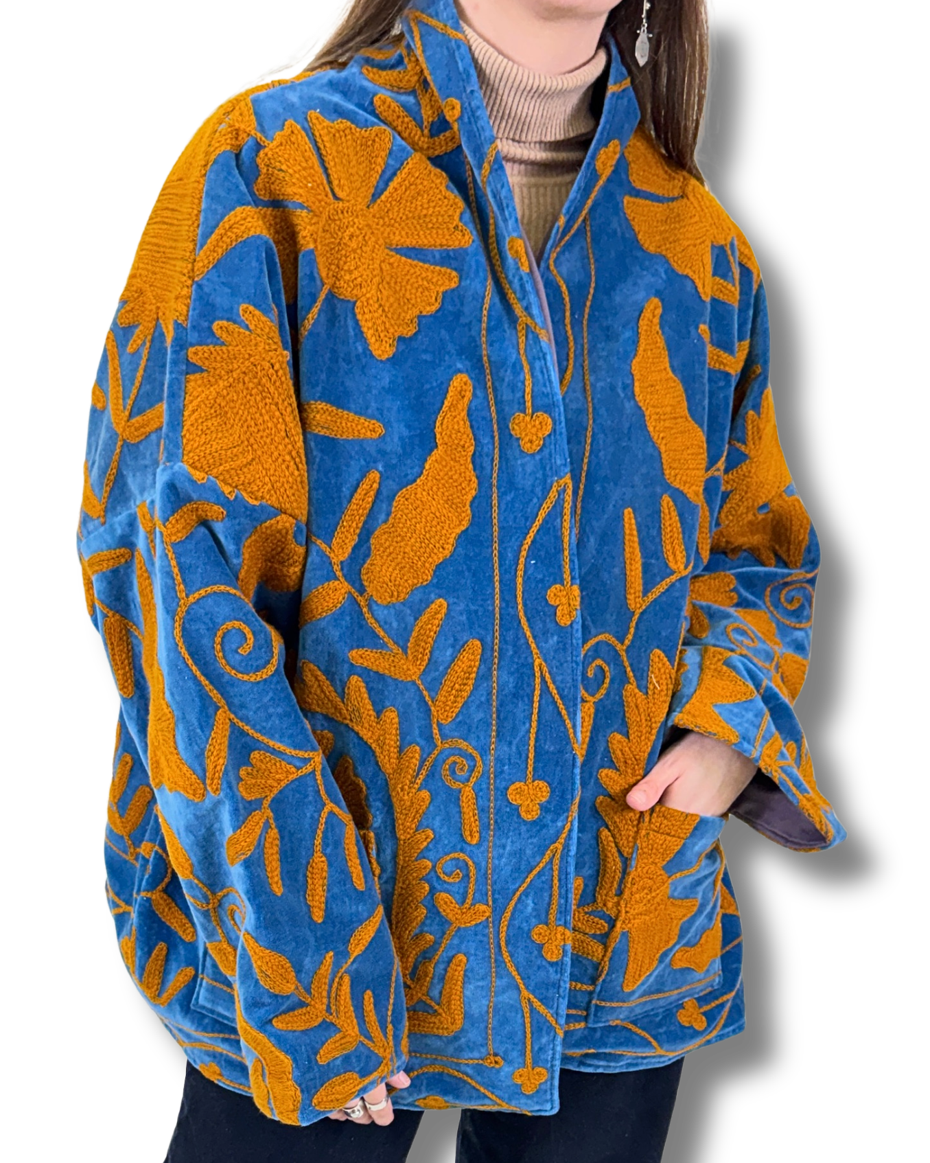 Vyšívaná bunda z jemného bavlněného sametu, v sobě propojuje pohodlí a výrazný design. Každá látka byla vytvořena na zakázku a finální podoba vznikla výběrem kombinací - vzoru látky, střihu a vnitřní podšívky. Vznikl tak jeden jediný kus. Bunda je originál.