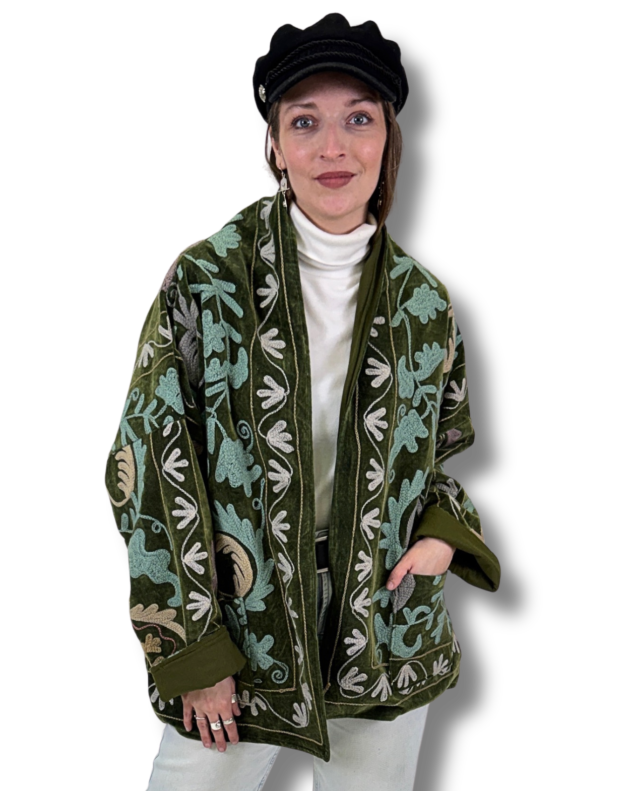 Vyšívaná bunda z jemného bavlněného sametu, v sobě propojuje pohodlí a výrazný design. Každá látka byla vytvořena na zakázku a finální podoba vznikla výběrem kombinací - vzoru látky, střihu a vnitřní podšívky. Vznikl tak jeden jediný kus. Bunda je originál.