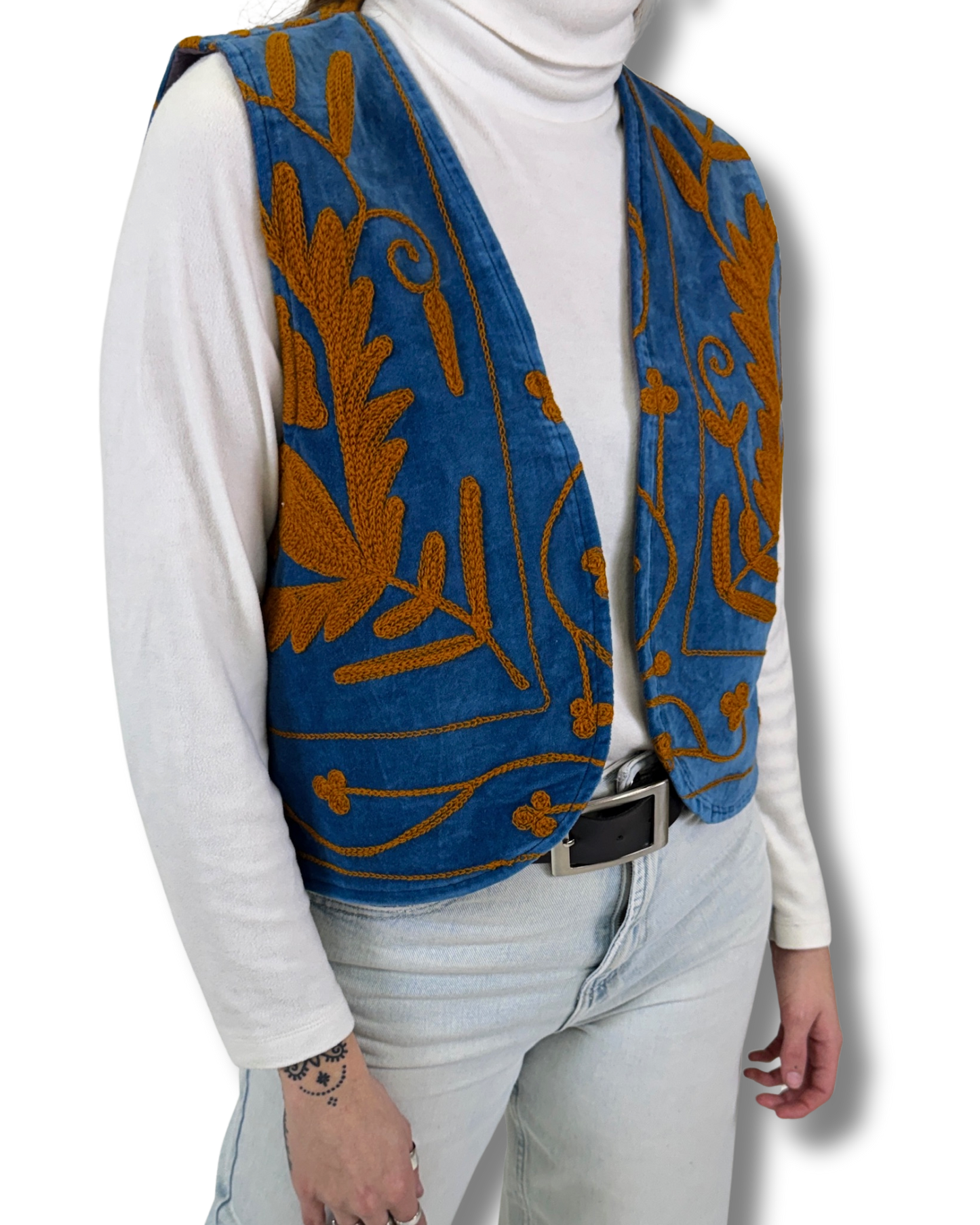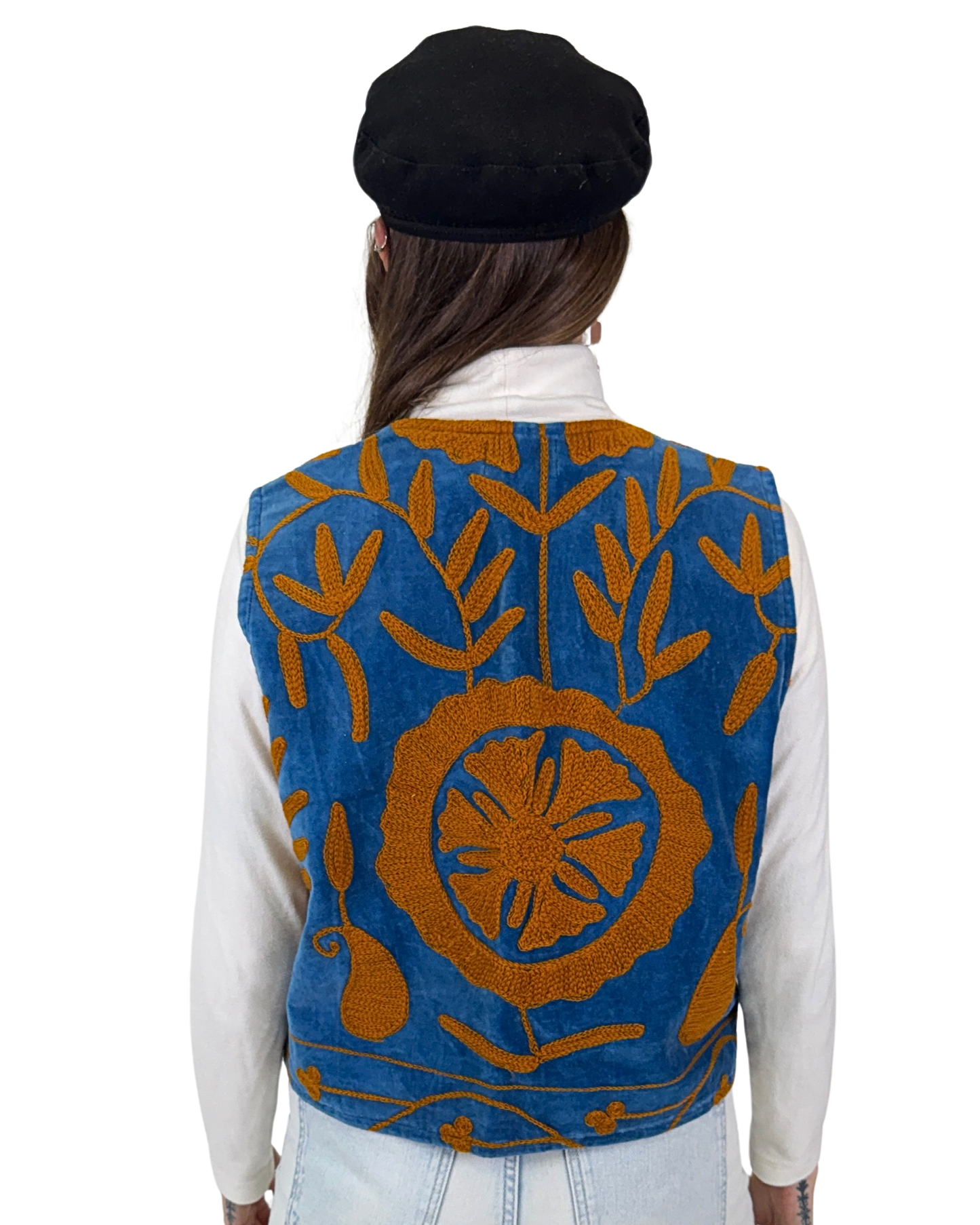 Vesta Rani vznikla z bavlněného sametu zdobeného SUZANI výšivkou. Každý kus je naprostý originál, zhotovený z jedinečné části látky, takže druhá stejná vesta už neexistuje. Luxusní samet dodává hloubku barvám i tvaru.