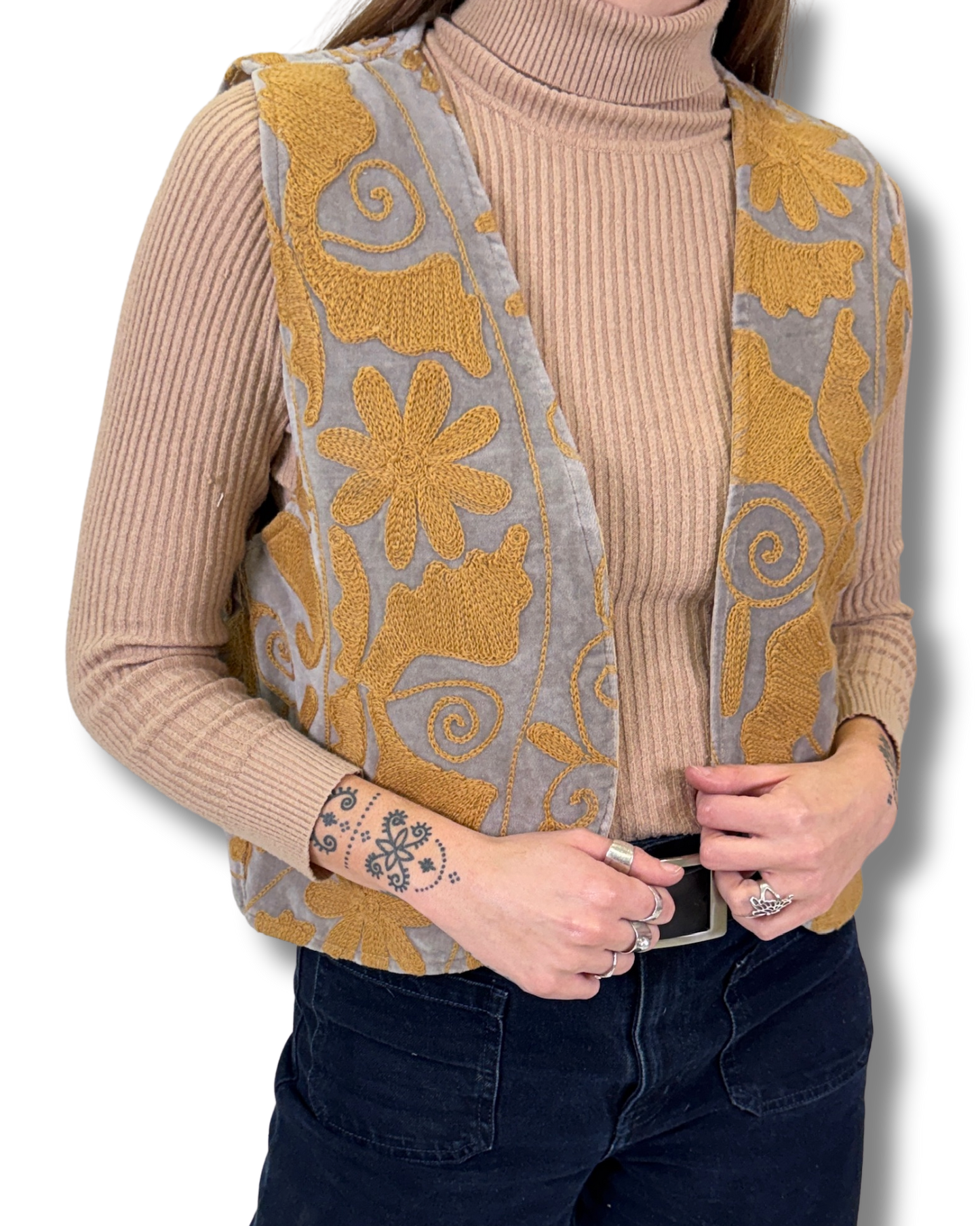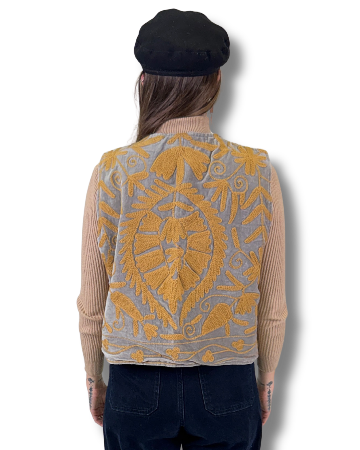 Vesta Rani vznikla z bavlněného sametu zdobeného SUZANI výšivkou. Každý kus je naprostý originál, zhotovený z jedinečné části látky, takže druhá stejná vesta už neexistuje. Luxusní samet dodává hloubku barvám i tvaru.