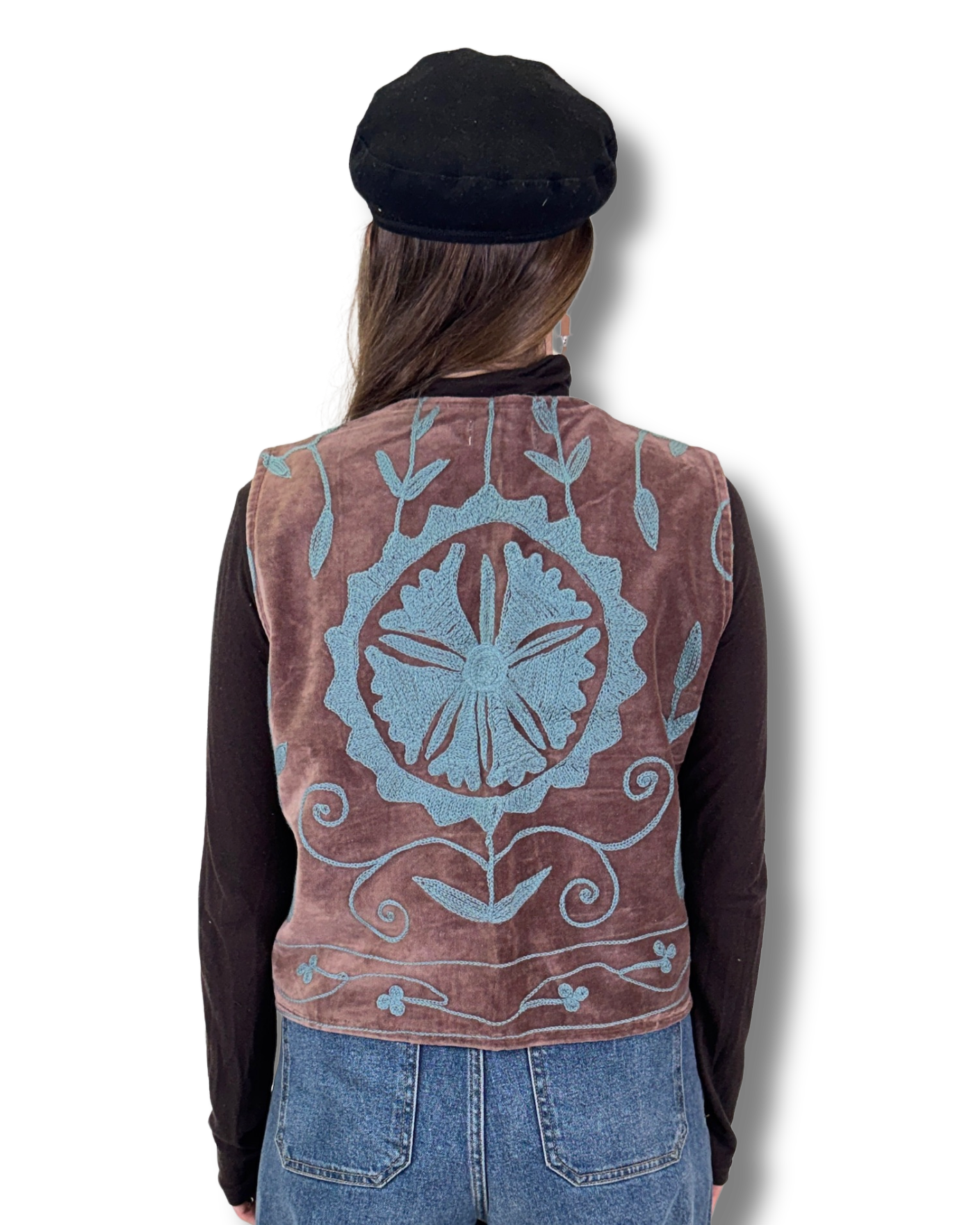 Vesta Rani vznikla z bavlněného sametu zdobeného SUZANI výšivkou. Každý kus je naprostý originál, zhotovený z jedinečné části látky, takže druhá stejná vesta už neexistuje. Luxusní samet dodává hloubku barvám i tvaru.