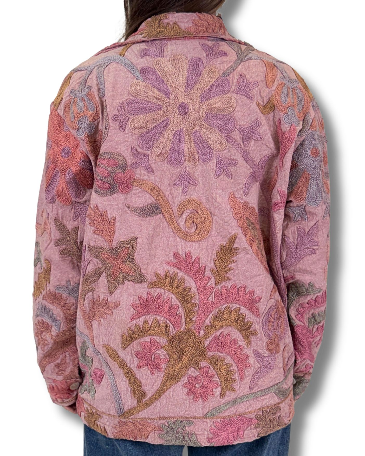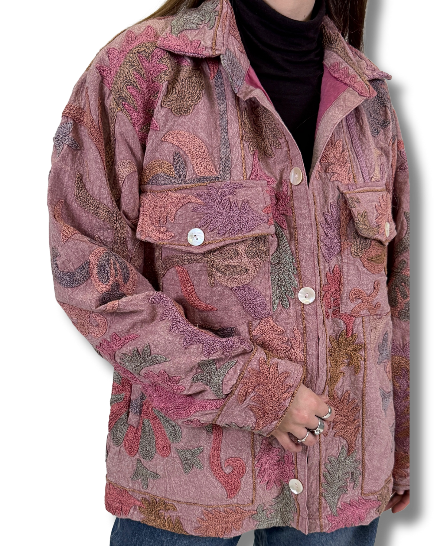 SUZANI košile, ušitá z látky, kterou ručně vyšila rodina řemeslníků v Rajasthánu. Každý steh nese kus tradice a příběhu. Látka vznikala pomalu, s úctou k řemeslu. Střih je pohodlný a nadčasový, vhodný pro každodenní nošení i výjimečné chvíle. Perleťové knoflíčky dodávají košili jemnost a lehkou eleganci. Unikátní kousek, originál.