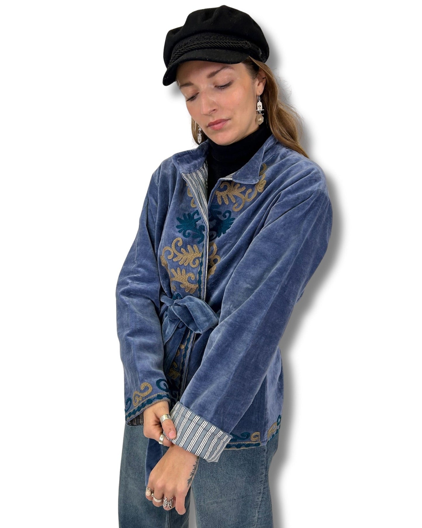 Kimono Amara je ztělesněním elegance a pohodlí. Ušité z jemného bavlněného sametu s bohatou strukturou, doplněné výšivkou a pruhovanou podšívkou, která dodává kontrast i osobitost.