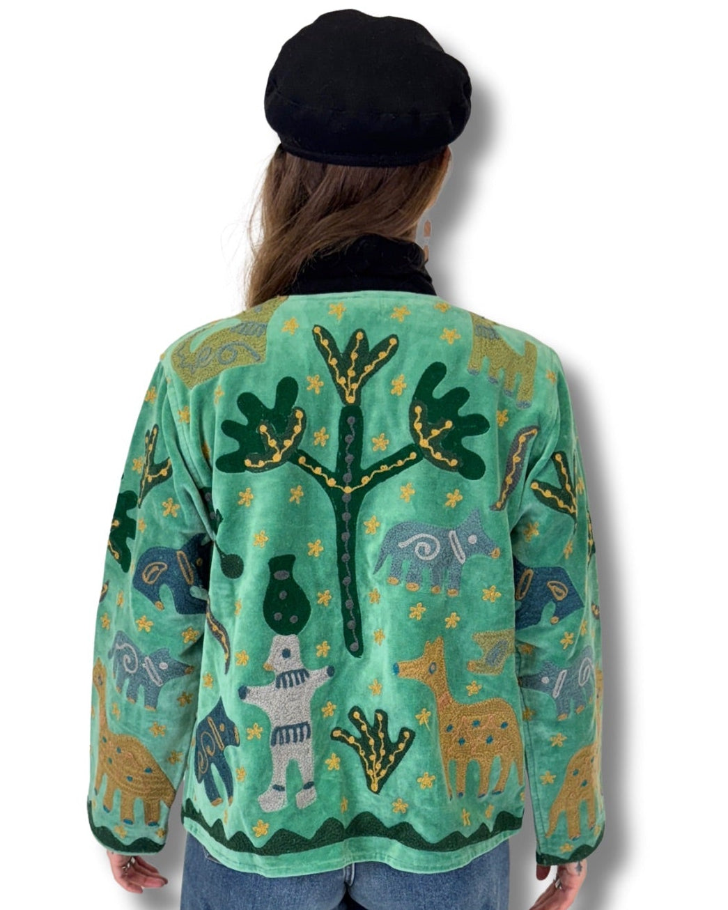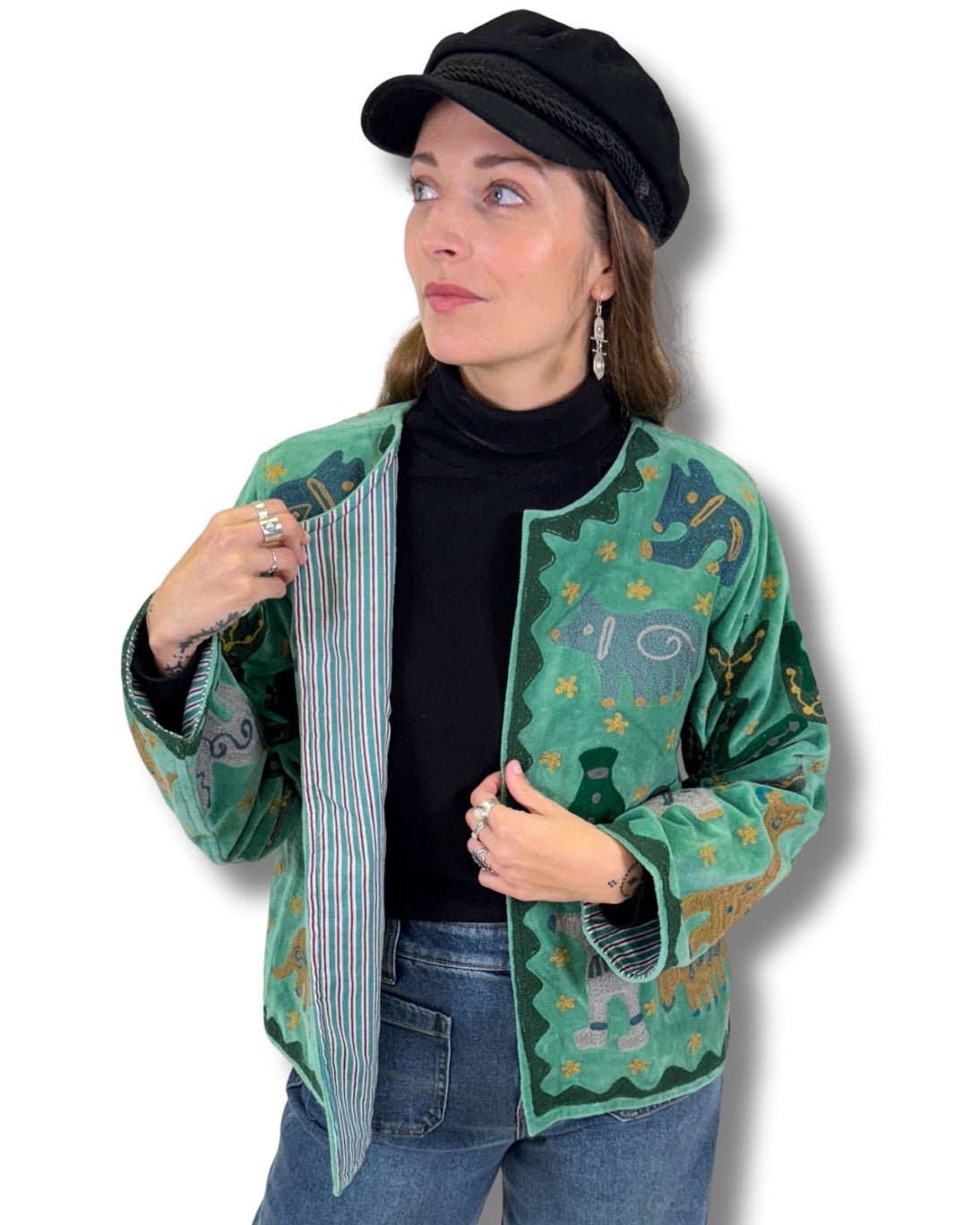 Bunda Rajira z jemného bavlněného sametu, v sobě propojuje pohodlí a výrazný design. Každá látka byla vytvořena na zakázku a finální podoba vznikla výběrem kombinací - vzoru látky, střihu a vnitřní podšívky. Vznikl tak jeden jediný kus.