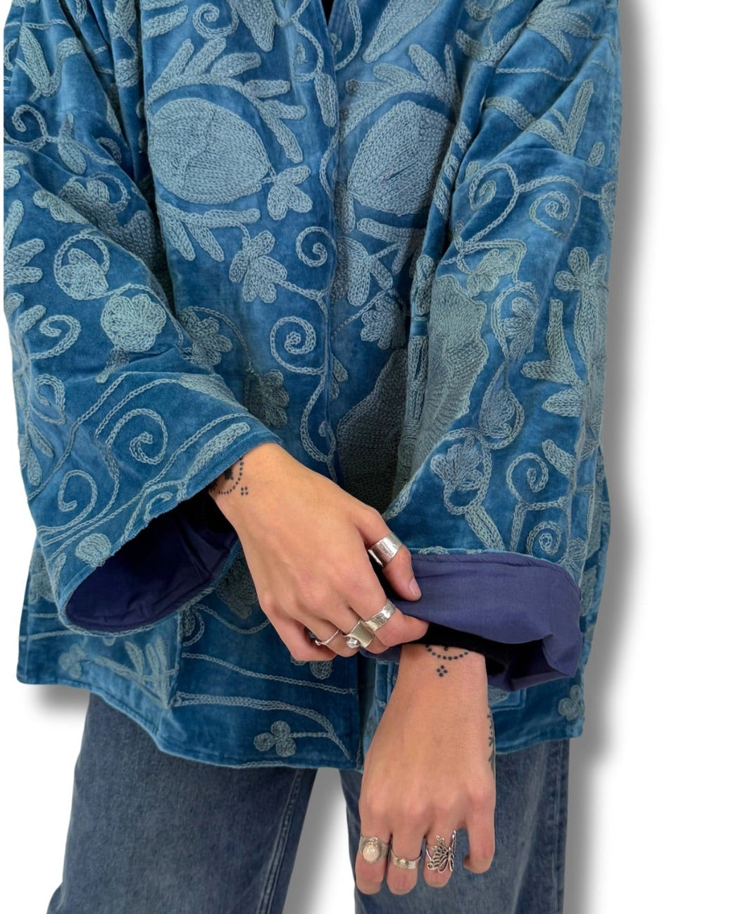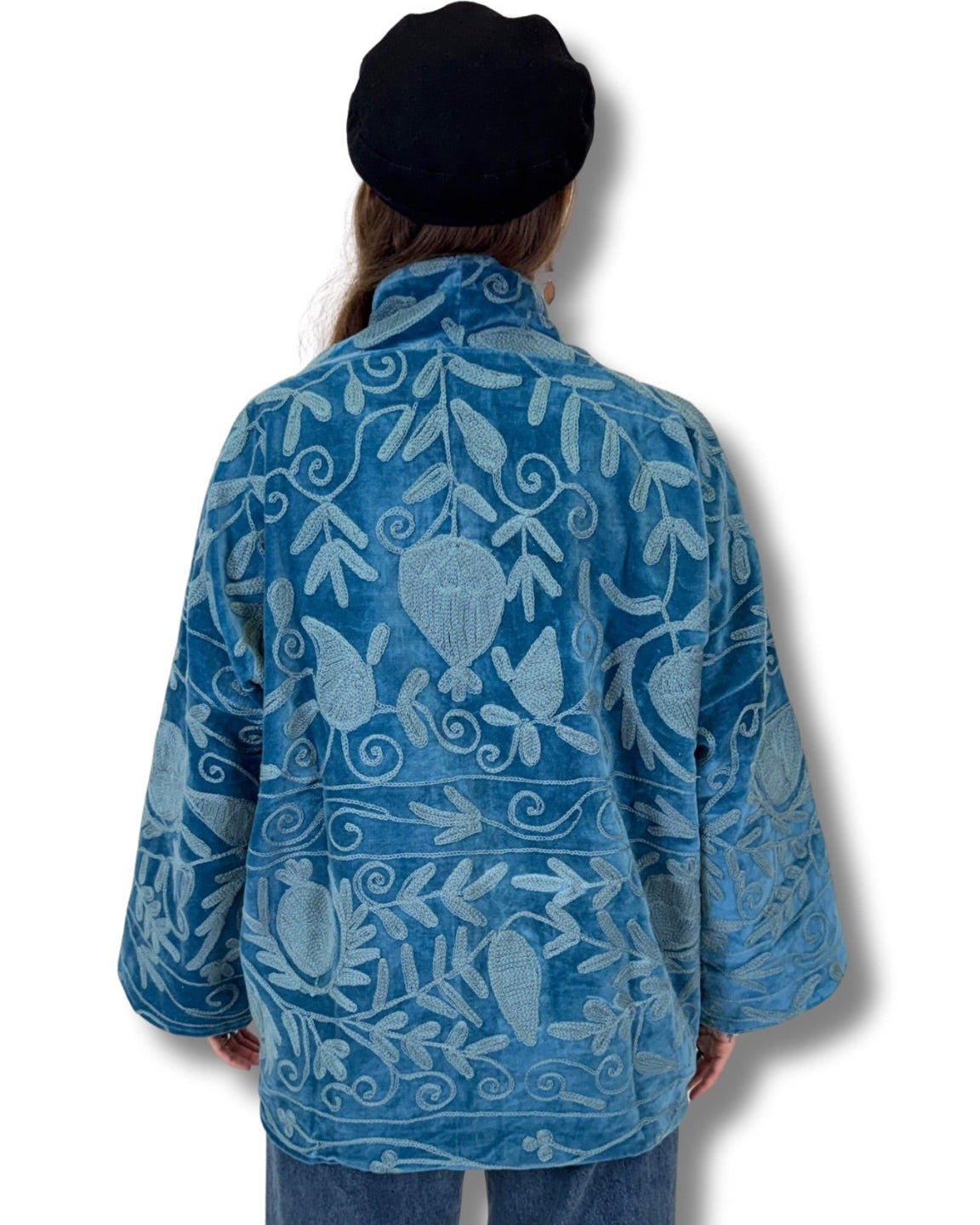 Vyšívaná bunda z jemného bavlněného sametu, v sobě propojuje pohodlí a výrazný design. Každá látka byla vytvořena na zakázku a finální podoba vznikla výběrem kombinací - vzoru látky, střihu a vnitřní podšívky. Vznikl tak jeden jediný kus. Bunda je originál.