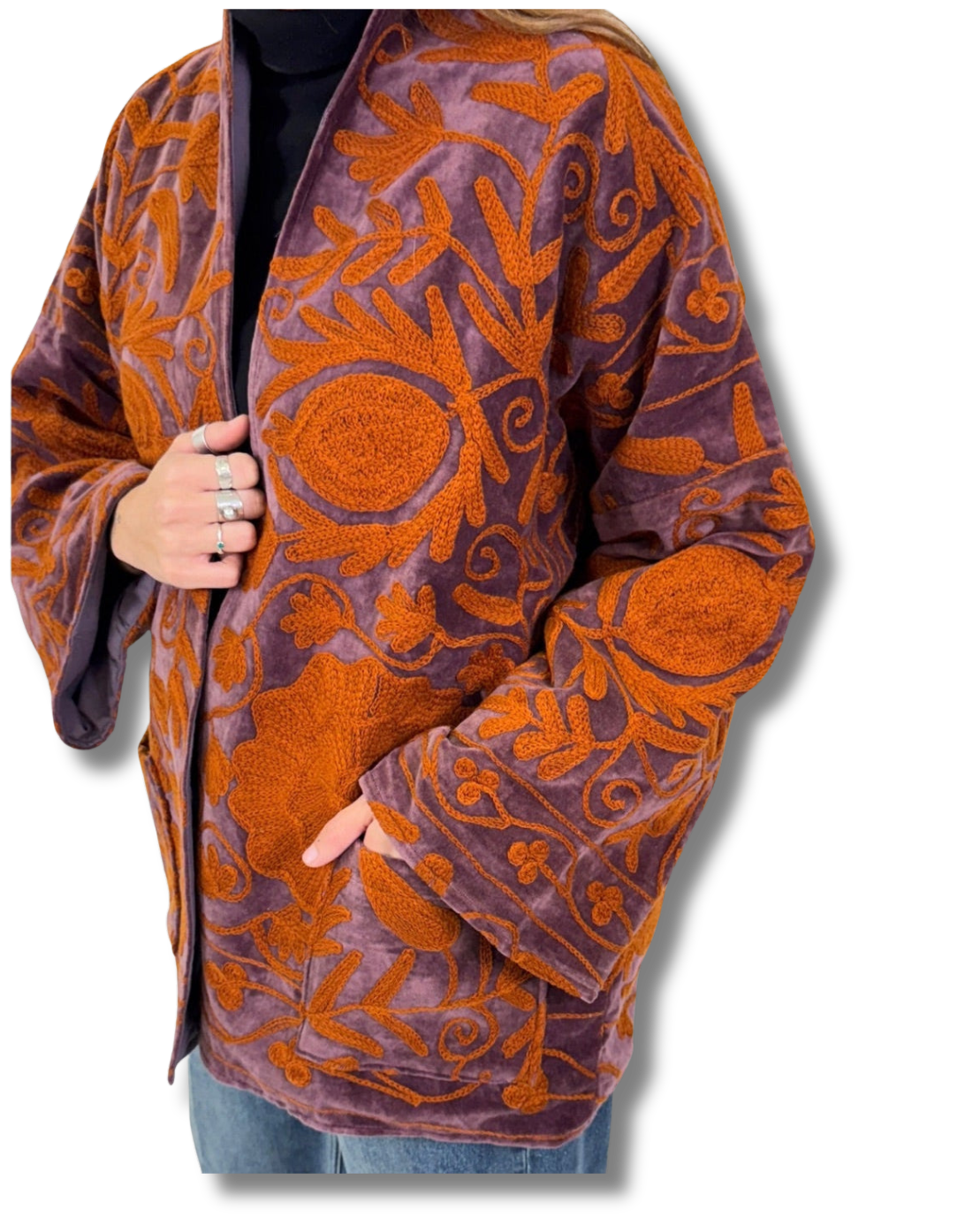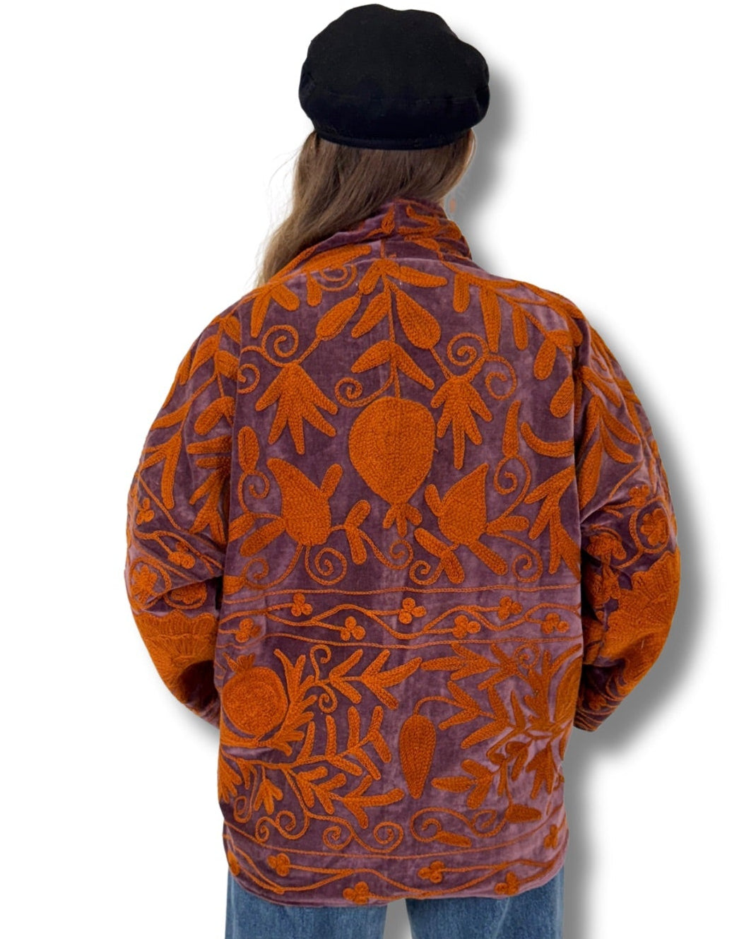 Vyšívaná bunda z jemného bavlněného sametu, v sobě propojuje pohodlí a výrazný design. Každá látka byla vytvořena na zakázku a finální podoba vznikla výběrem kombinací - vzoru látky, střihu a vnitřní podšívky. Vznikl tak jeden jediný kus. Bunda je originál.