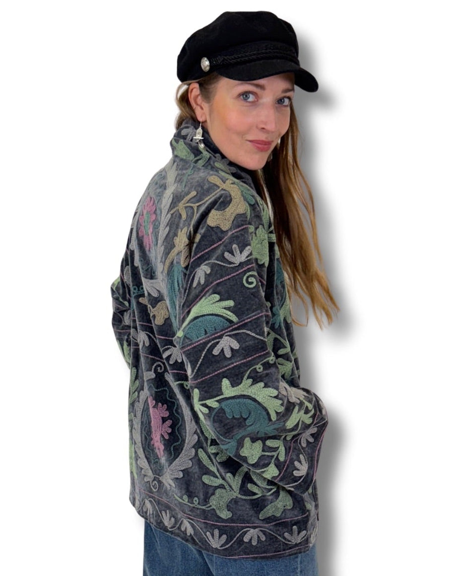 Vyšívaná bunda z jemného bavlněného sametu, v sobě propojuje pohodlí a výrazný design. Každá látka byla vytvořena na zakázku a finální podoba vznikla výběrem kombinací - vzoru látky, střihu a vnitřní podšívky. Vznikl tak jeden jediný kus. Bunda je originál.
