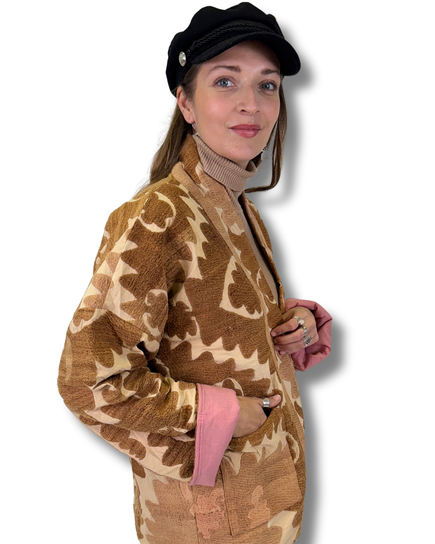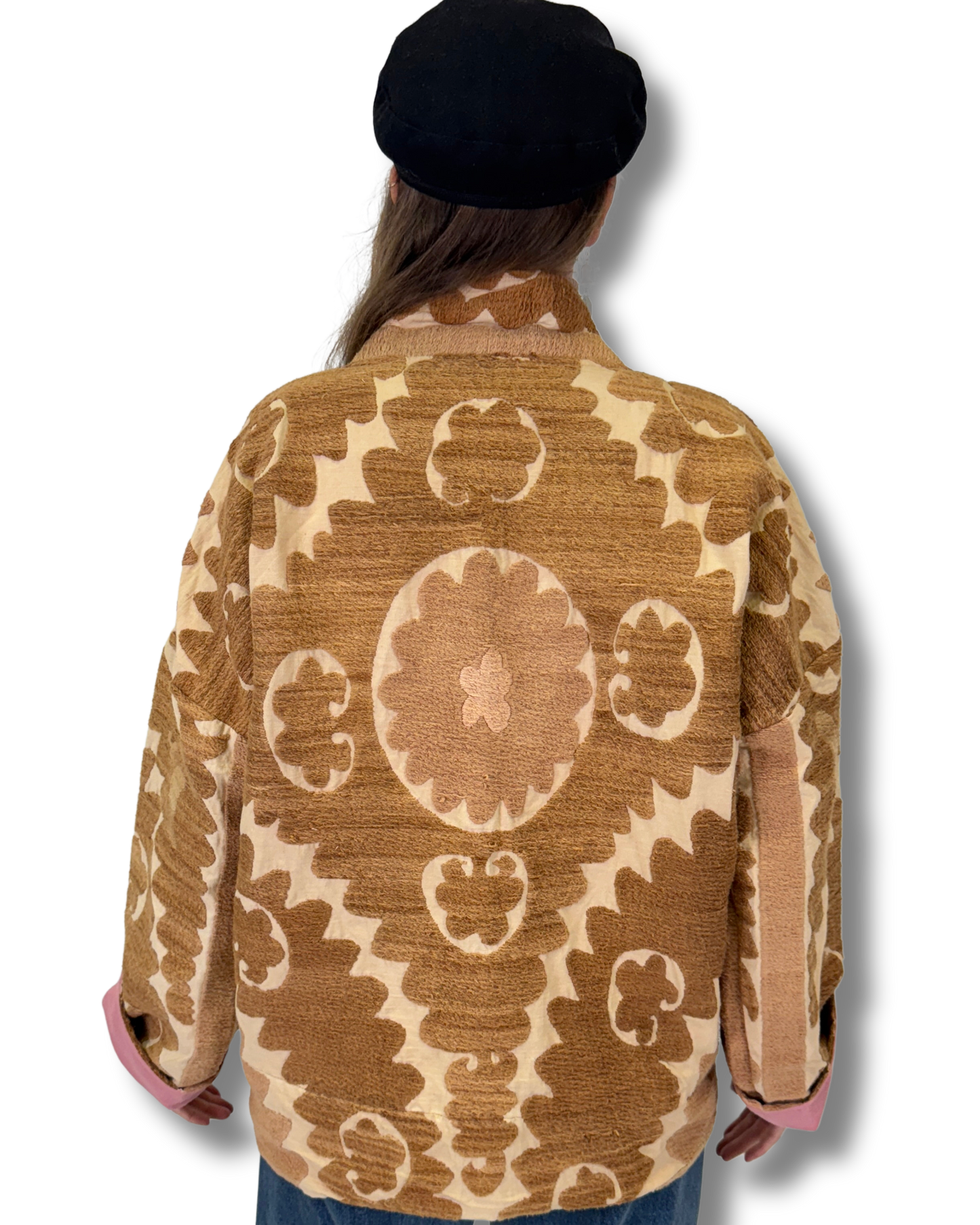 Bunda Zamira vznikla z autentických uzbeckých SUZANI látek, které putovaly z Uzbekistánu až do Indie, kde dostaly nový život v podobě originálního kimonového střihu.