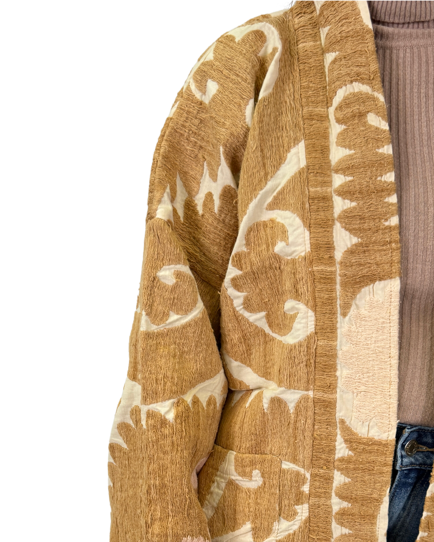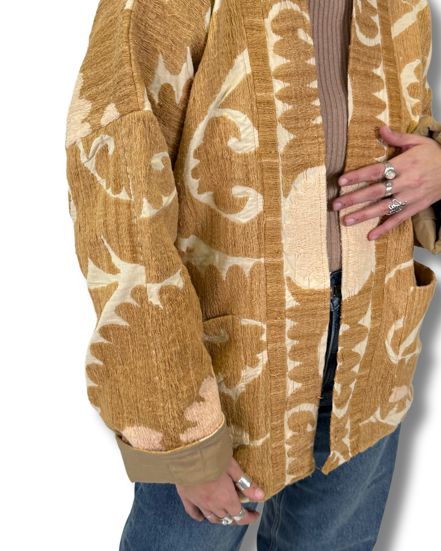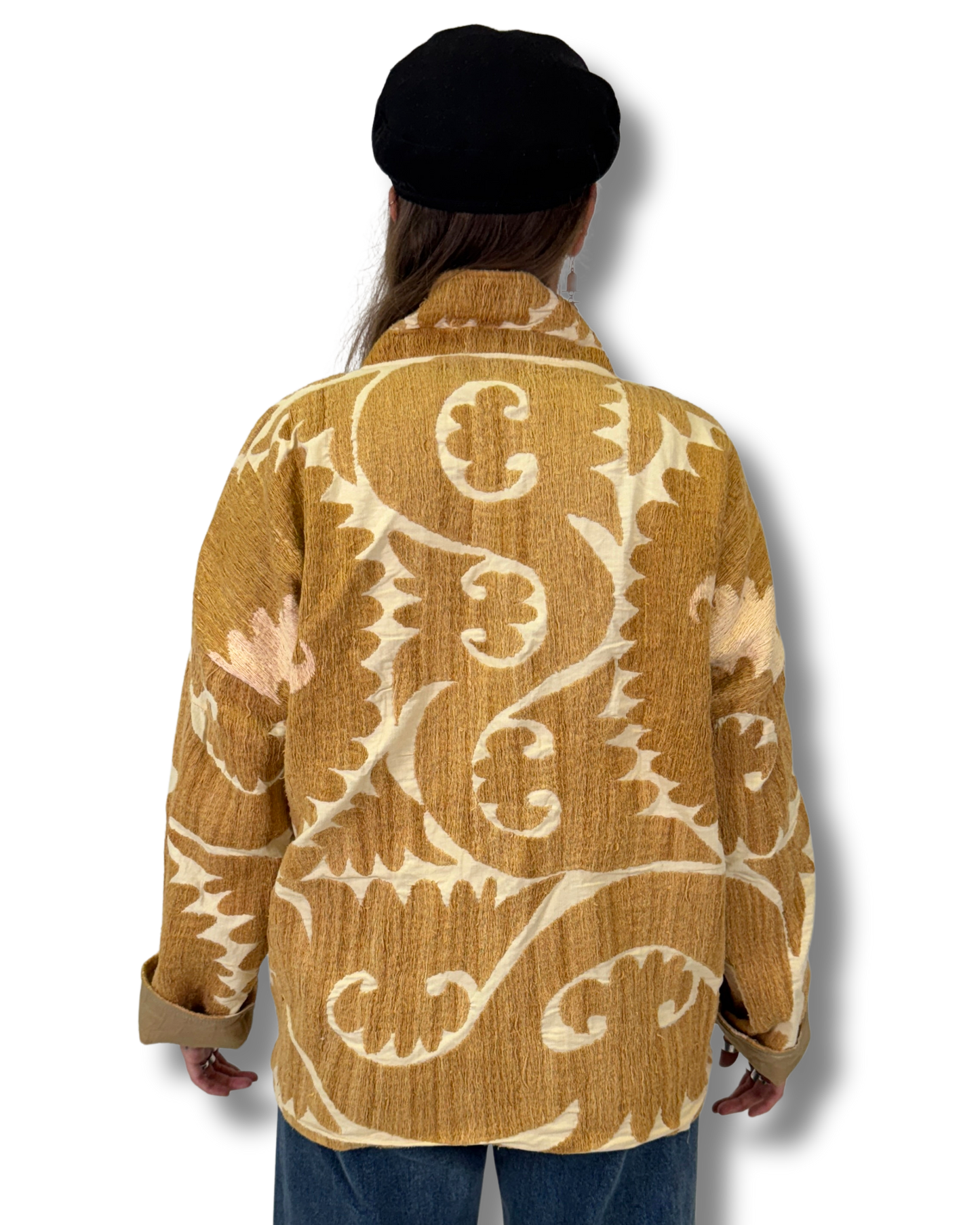 Bunda Zamira vznikla z autentických uzbeckých SUZANI látek, které putovaly z Uzbekistánu až do Indie, kde dostaly nový život v podobě originálního kimonového střihu.