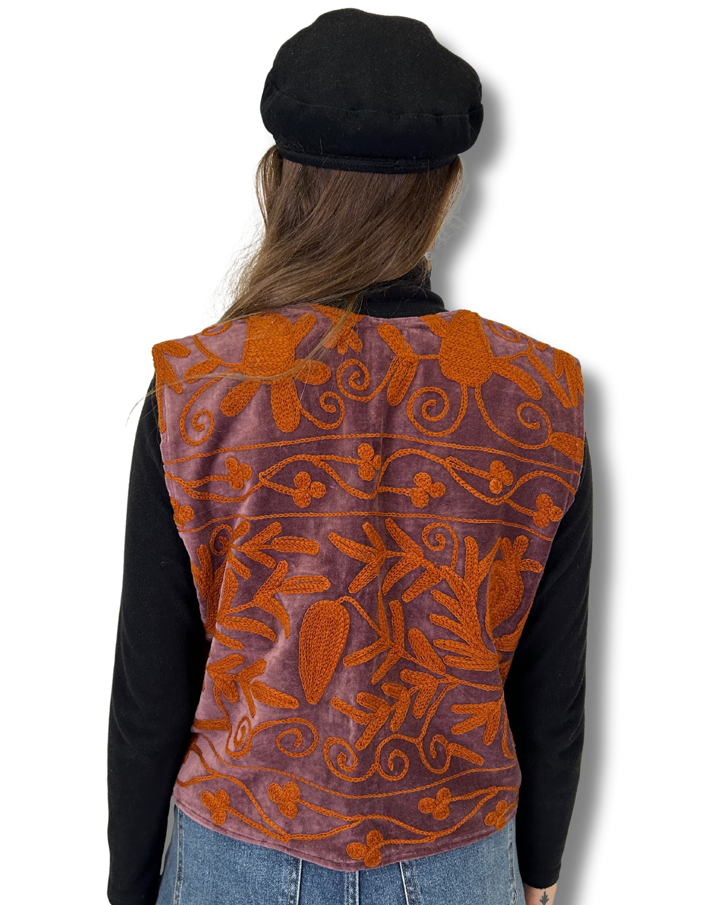 Vesta Rani vznikla z bavlněného sametu zdobeného SUZANI výšivkou. Každý kus je naprostý originál, zhotovený z jedinečné části látky, takže druhá stejná vesta už neexistuje. Luxusní samet dodává hloubku barvám i tvaru a výšivka přináší duši orientálního řemesla.