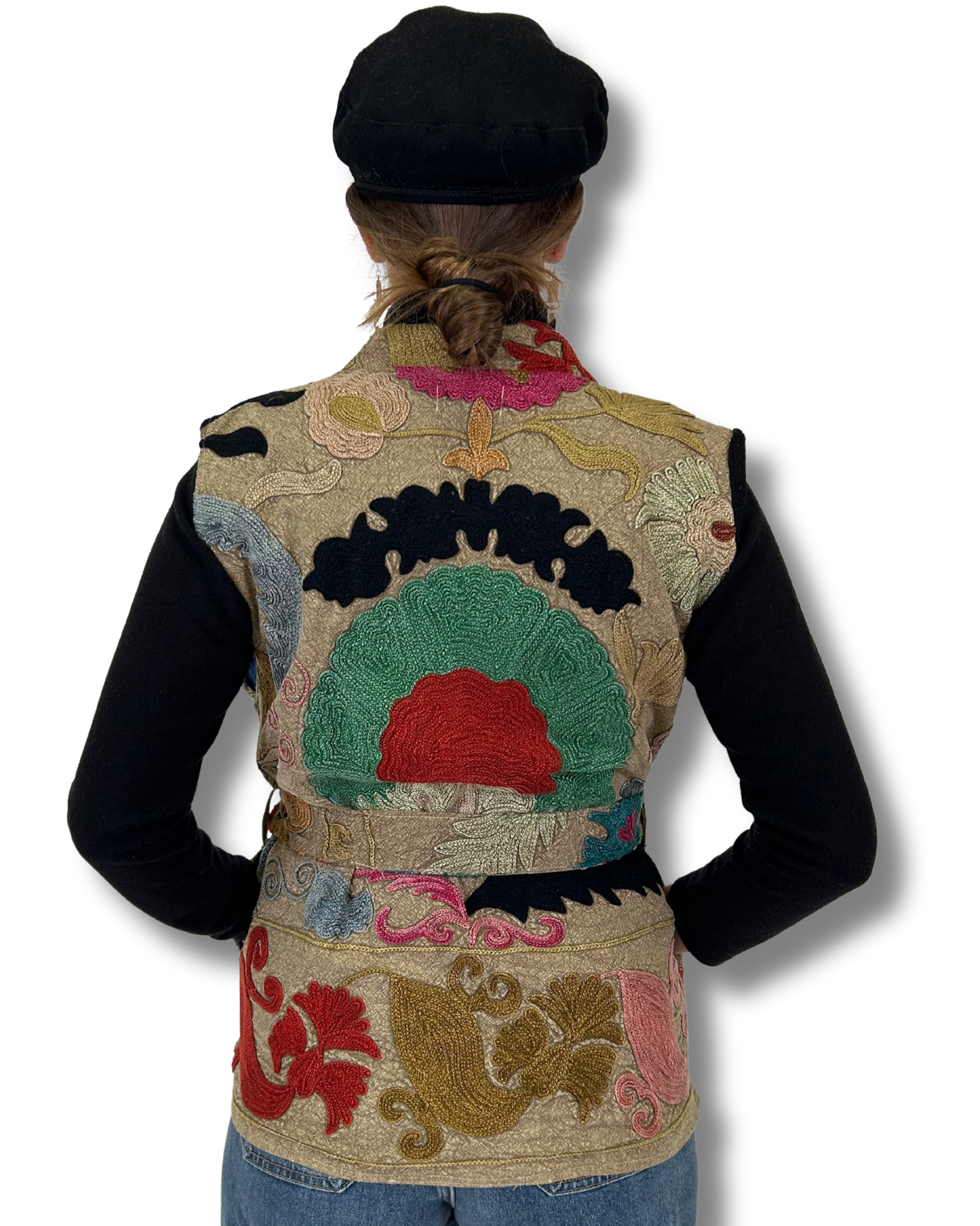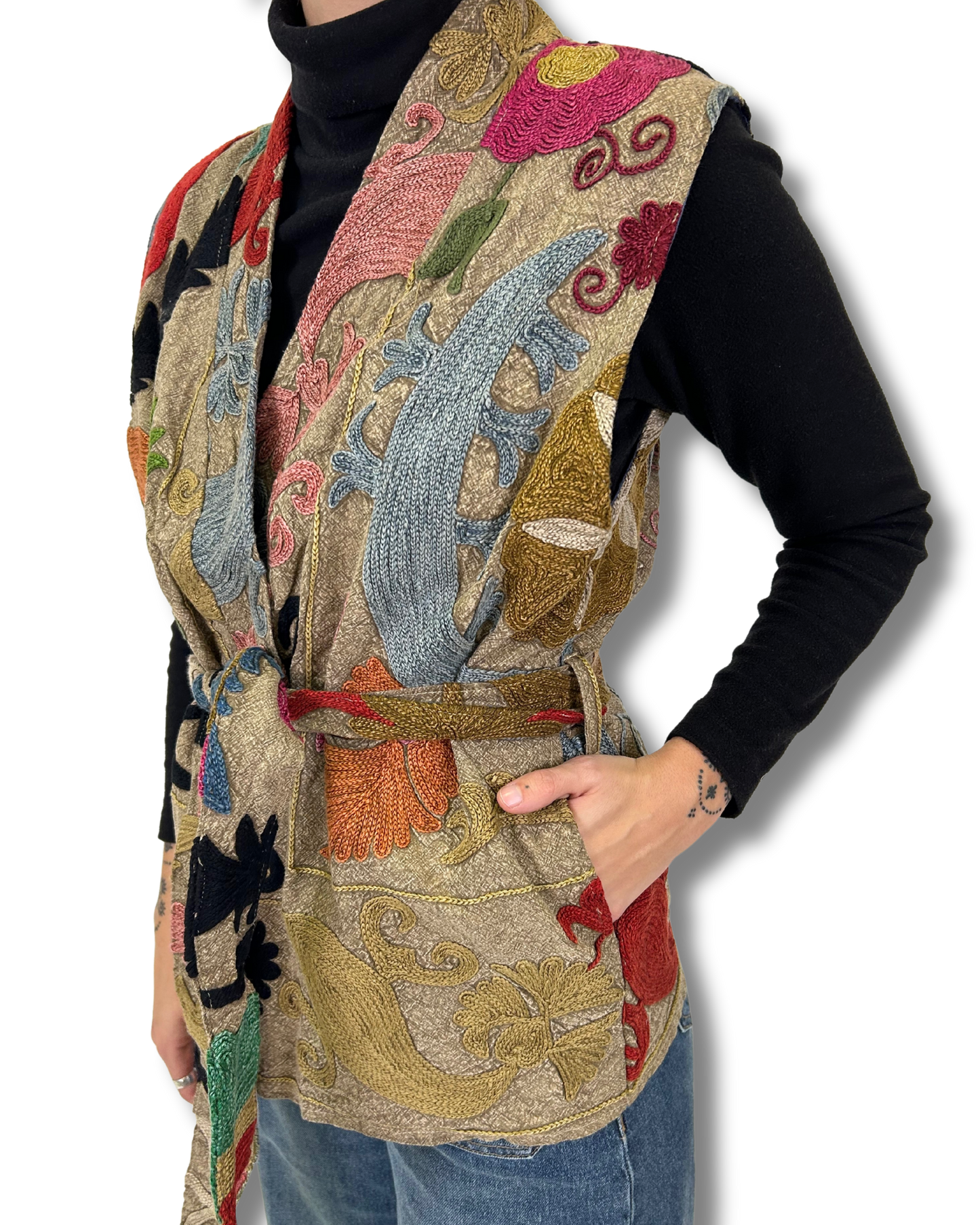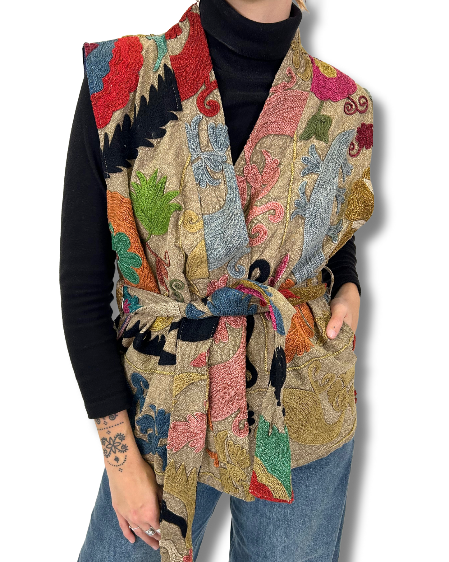 Unikátní vesta z kolekce Suzani, která v sobě nese kouzlo ručně vyšívané látky a nadčasový design. Každý kus je originál. Od pečlivě vybrané látky až po vnitřní podšívku, která je vždy jiná. Každý kus použité látky je výsledkem hodin trpělivé ruční práce a rodinné tradice, která se předává z generace na generaci.