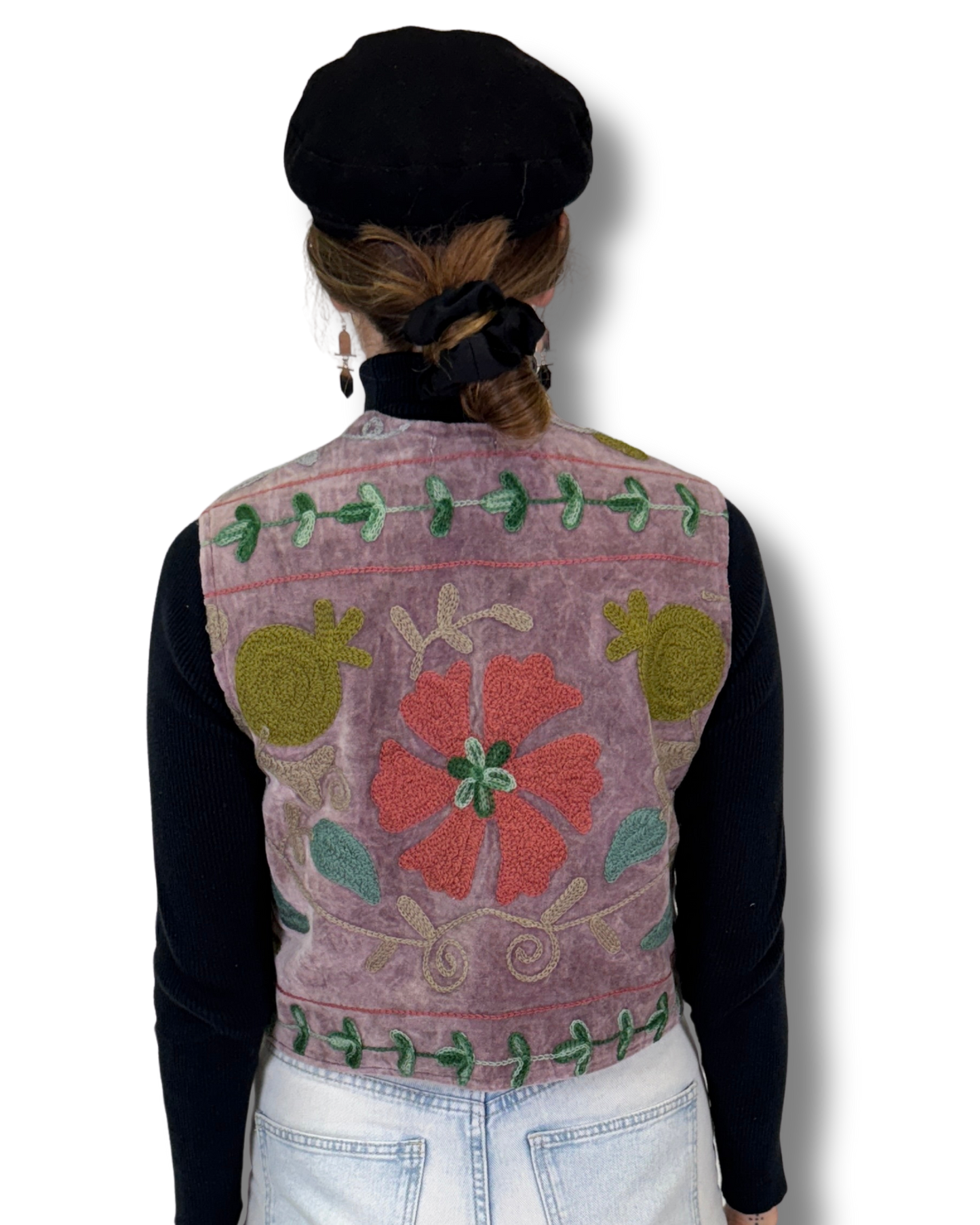 Vesta Rani vznikla z bavlněného sametu zdobeného SUZANI výšivkou. Každý kus je naprostý originál, zhotovený z jedinečné části látky, takže druhá stejná vesta už neexistuje. Luxusní samet dodává hloubku barvám i tvaru a výšivka přináší duši orientálního řemesla.