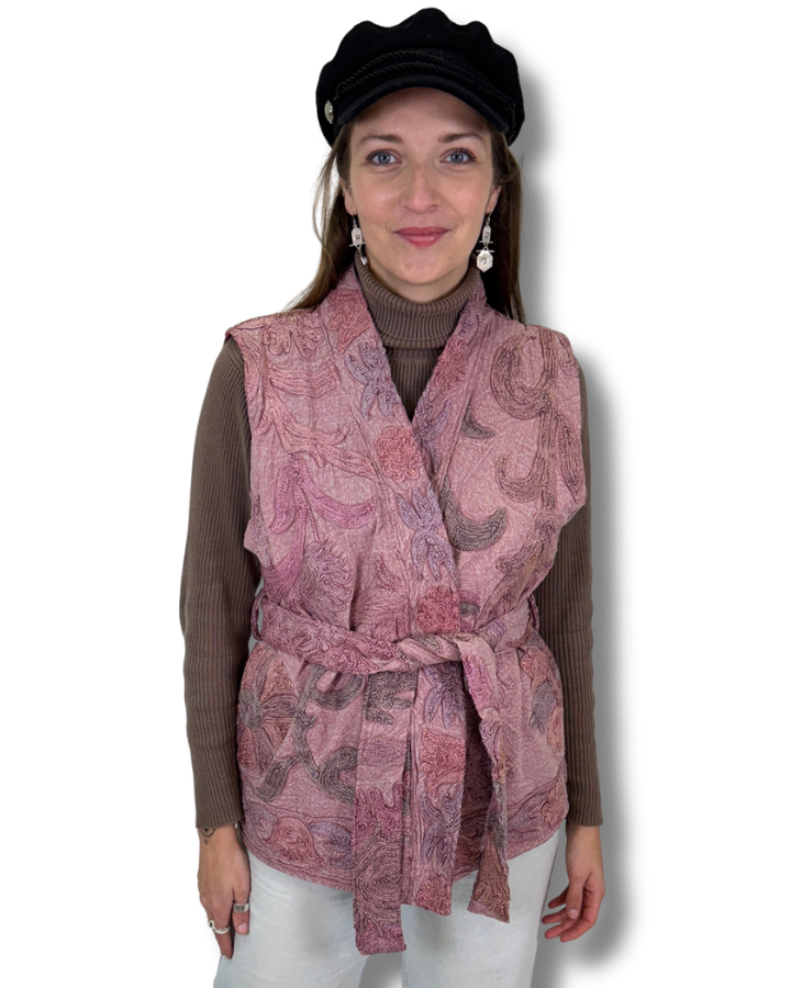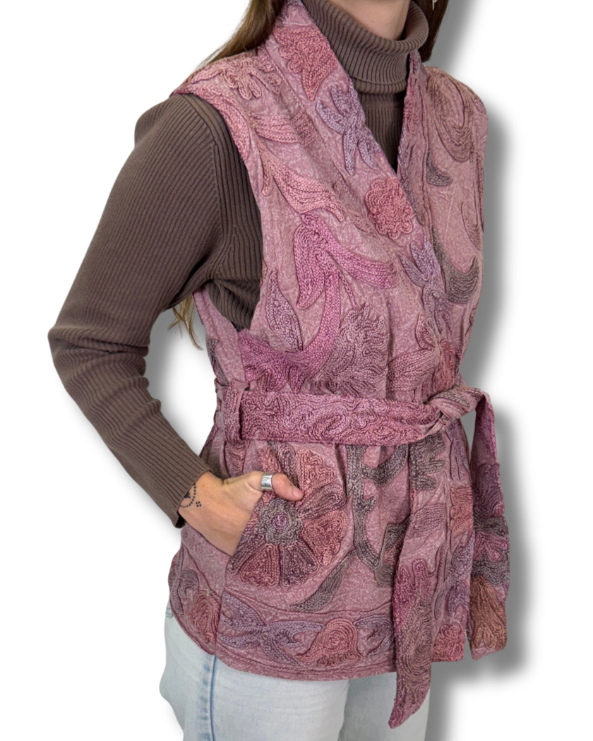 Unikátní vesta z kolekce Suzani, která v sobě nese kouzlo ručně vyšívané látky a nadčasový design. Každý kus je originál. Od pečlivě vybrané látky až po vnitřní podšívku, která je vždy jiná. Každý kus použité látky je výsledkem hodin trpělivé ruční práce a rodinné tradice, která se předává z generace na generaci.