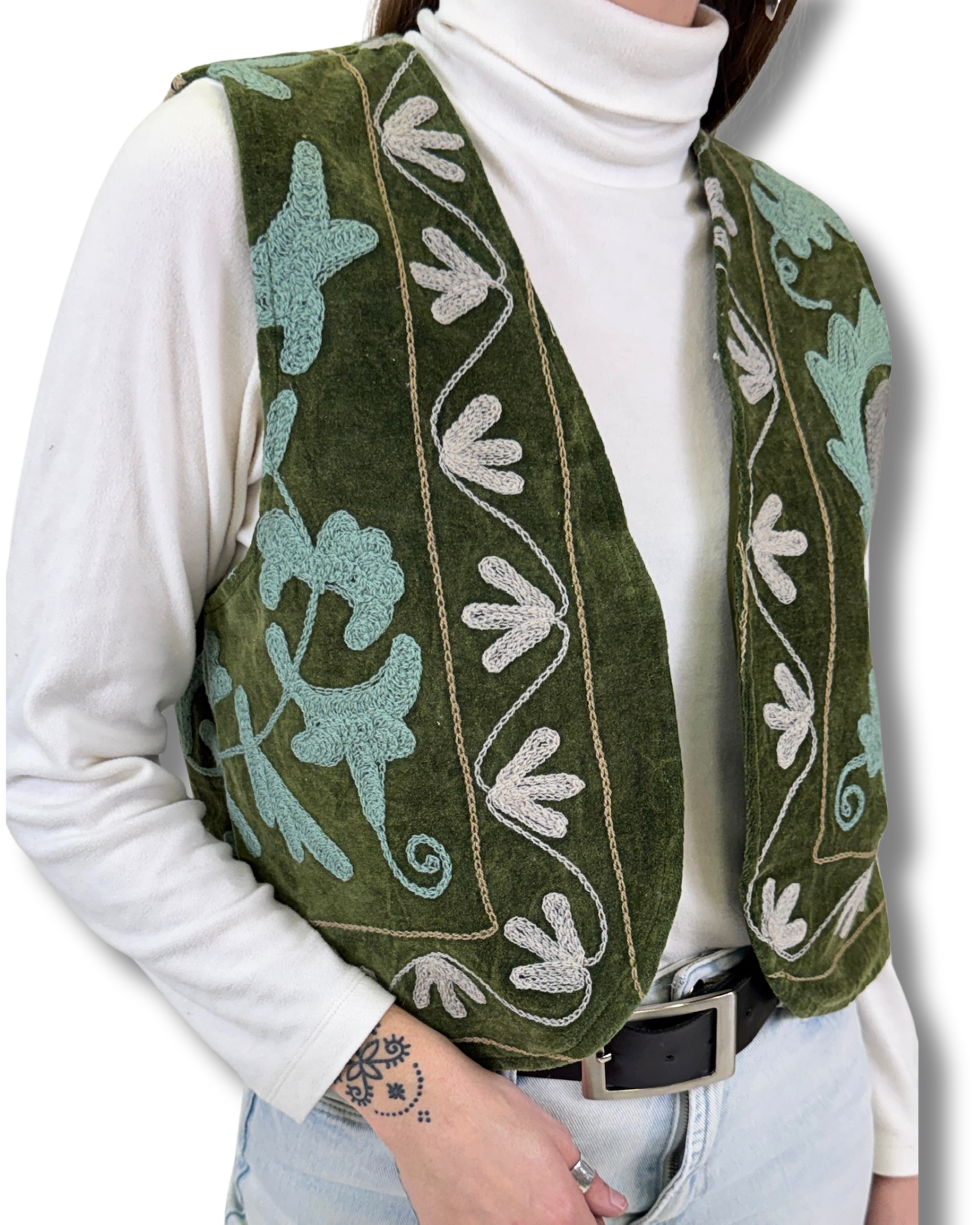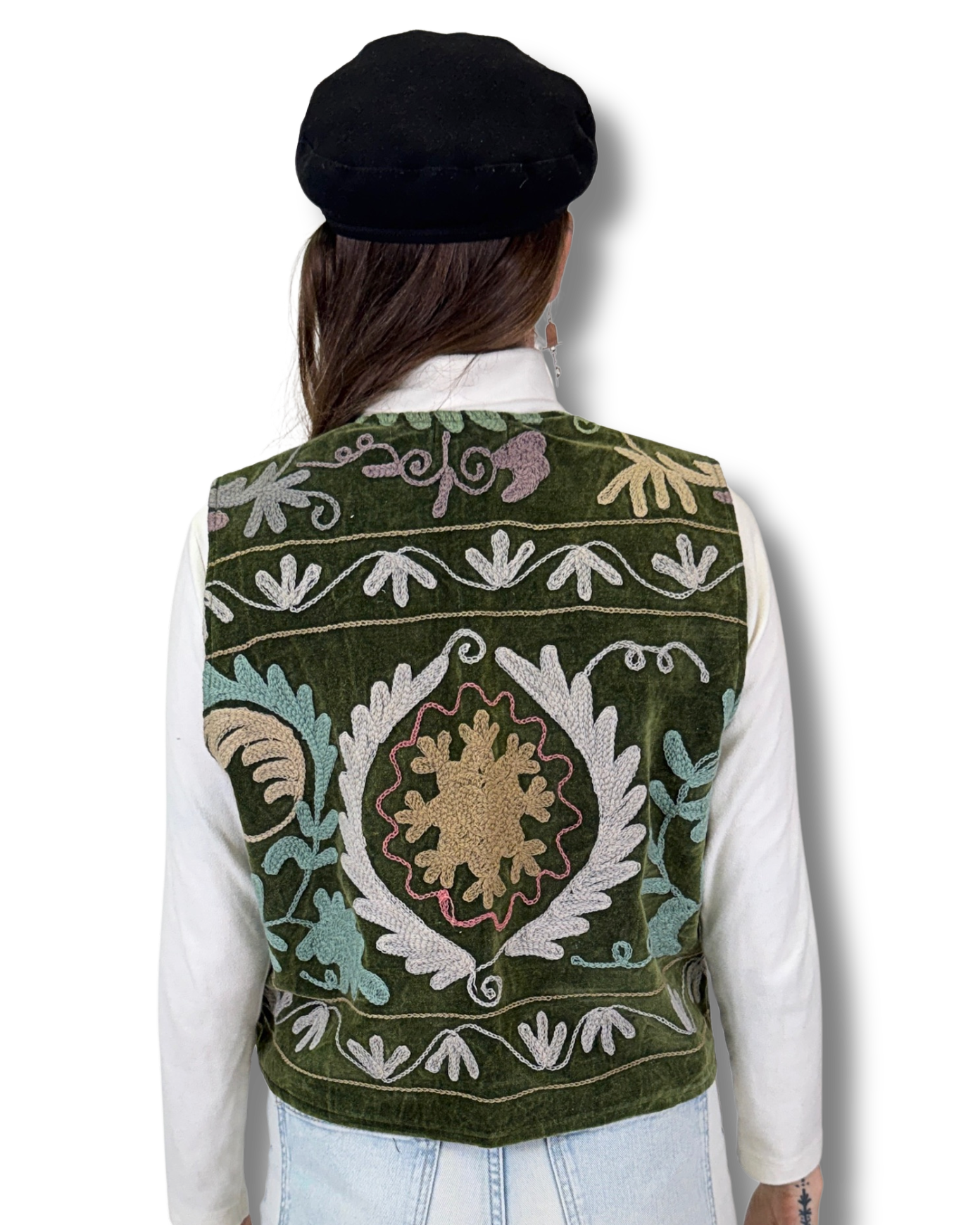 Vesta Rani vznikla z bavlněného sametu zdobeného SUZANI výšivkou. Každý kus je naprostý originál, zhotovený z jedinečné části látky, takže druhá stejná vesta už neexistuje. Luxusní samet dodává hloubku barvám i tvaru.
