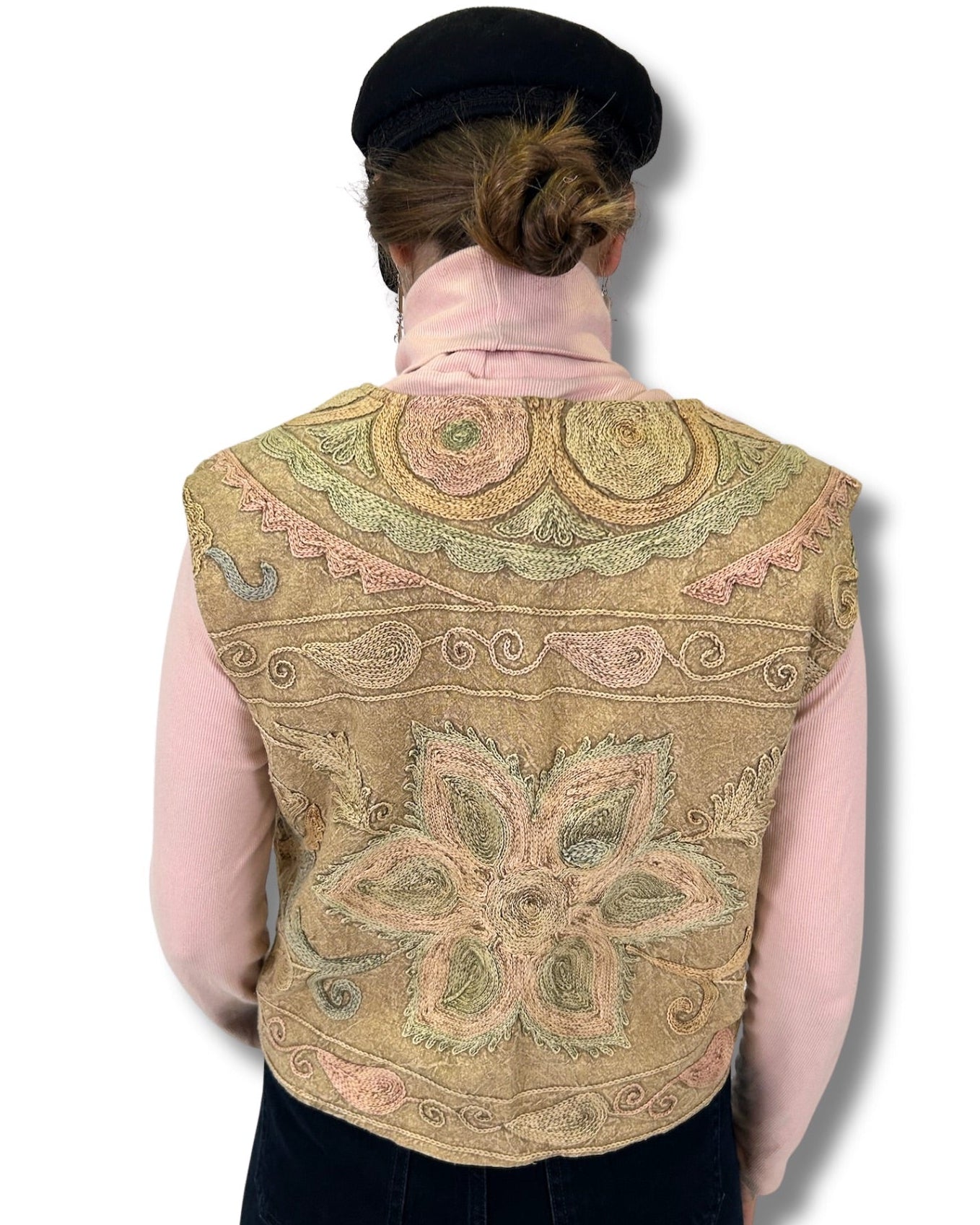 Unikátní vesta z kolekce Suzani, která v sobě nese kouzlo ručně vyšívané látky a nadčasový design. Každý kus je originál. Od pečlivě vybrané látky až po vnitřní podšívku, která je vždy jiná. Každý kus použité látky je výsledkem hodin trpělivé ruční práce a rodinné tradice, která se předává z generace na generaci.