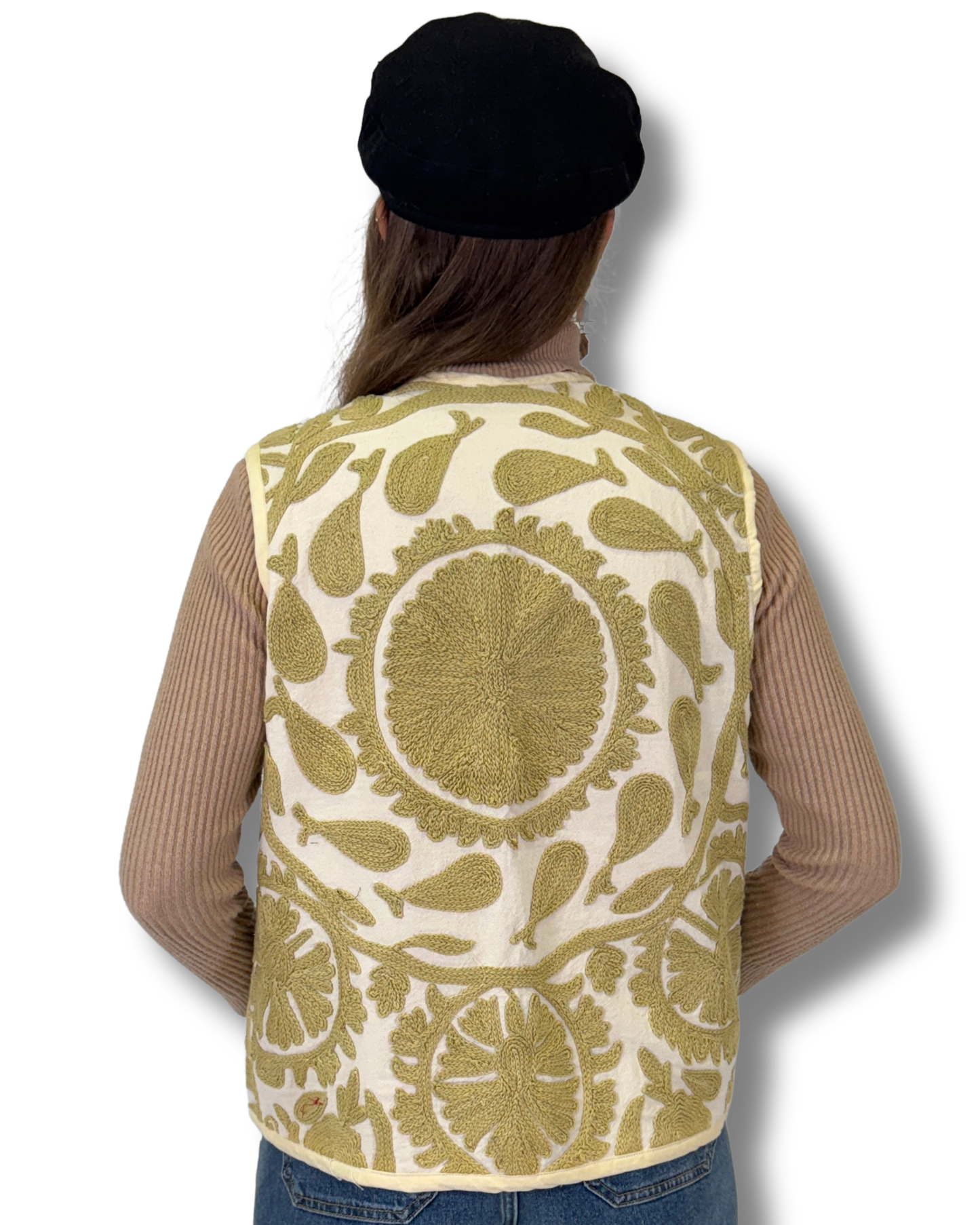 Unikátní vesta z kolekce Suzani, která v sobě nese kouzlo ručně vyšívané látky a nadčasový design. Každý kus je originál. Od pečlivě vybrané látky až po vnitřní podšívku, která je vždy jiná. Každý kus použité látky je výsledkem hodin trpělivé ruční práce a rodinné tradice, která se předává z generace na generaci.